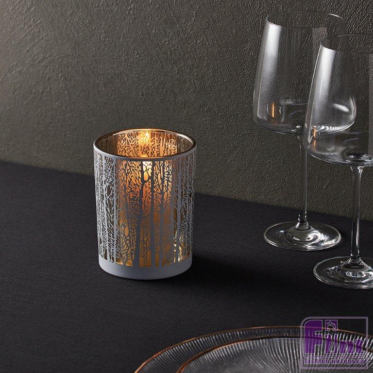 Кроме того, коллекция White Line включает в себя скатерти двух привычных размеров, салфетки с кольцами в комплекте, декоративную скатерть-дорожку на стол и целых три декоративных стеклянных подсвечника. Два подсвечника – это фантазии на тему классики, и ещё один – подсвечник для свечей-таблеток, украшенный силуэтом зимнего леса.