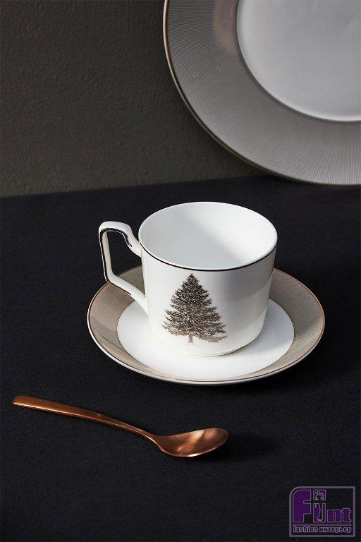 Вторая коллекция изготовлена из белоснежного фарфора и украшена золотым кантом и золотым декором в виде новогодних ёлочек. В компанию к тарелкам и чашкам идут бокалы-конусы с инкрустированной розовыми стразами круглой ножкой — вместе они создают образ «тихой», неброской роскоши на новогоднем столе.