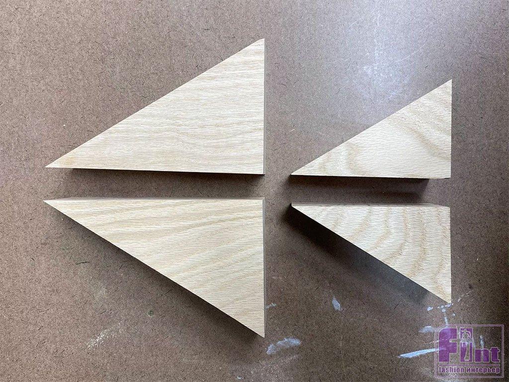 Вырежьте 4 прямоугольных треугольника из деревянной доски толщиной около 2-3 см. Два треугольника должны иметь длинную сторону, противоположную прямому углу, около 20 см. Два других треугольника должны иметь эту сторону около 12-13 см. При таких длинах гипотенузы, высота треугольников должны быть около 17 см для большого треугольника и около 11 см для маленького.