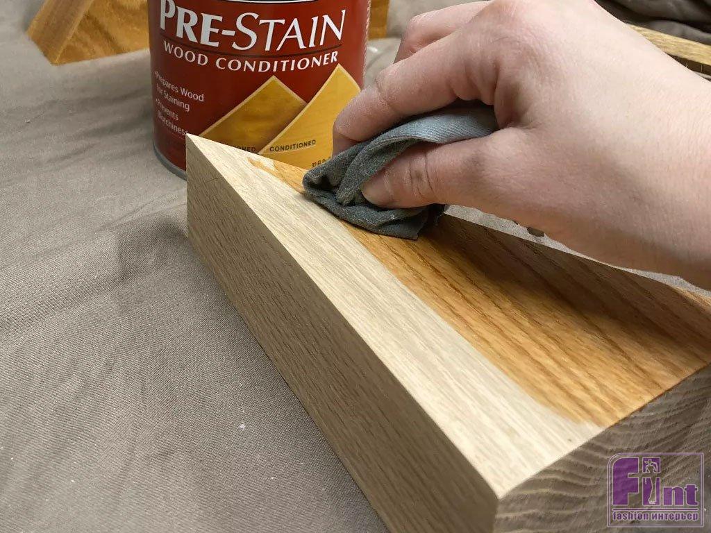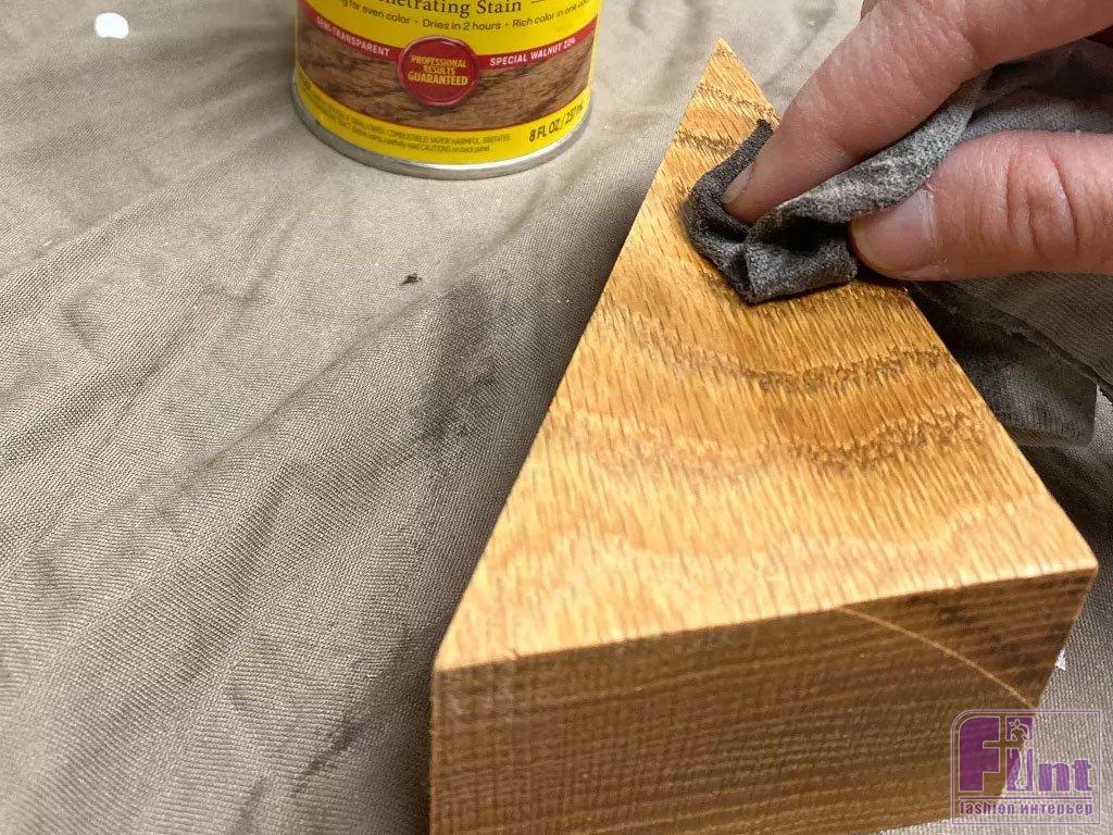 После высыхания грунтовочного состава (ориентировочно, через 2-3 часа), нанесите подходящую по цвету морилку для дерева. Мы выбрали приятный оттенок орехового дерева. Морилку проще всего наносить тряпкой, втирая материал в древесину.