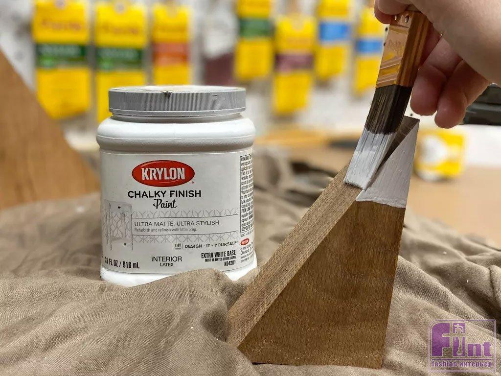 Как только морилка высохнет, добавьте вашим горным вершинам снежные «шапки», покрасив верхние углы треугольников белой акриловой краской. Чтобы получить чистый белый цвет, вероятно, может потребоваться нанести 2 слоя краски с небольшим межслойным временным интервалом для просушки.