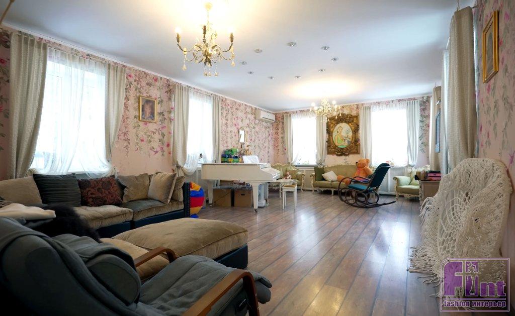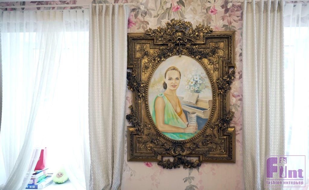 Мебель прекрасно подходит к остальному дизайну – она нежная, светлая, обита тканью в цветочек, имеет резные подлокотники и спинки. Пол в гостиной уложен светлым паркетом, центральная люстра в виде набора подсвечников сияет позолотой, а прямо в центре комнаты висит огромный портрет хозяйки.