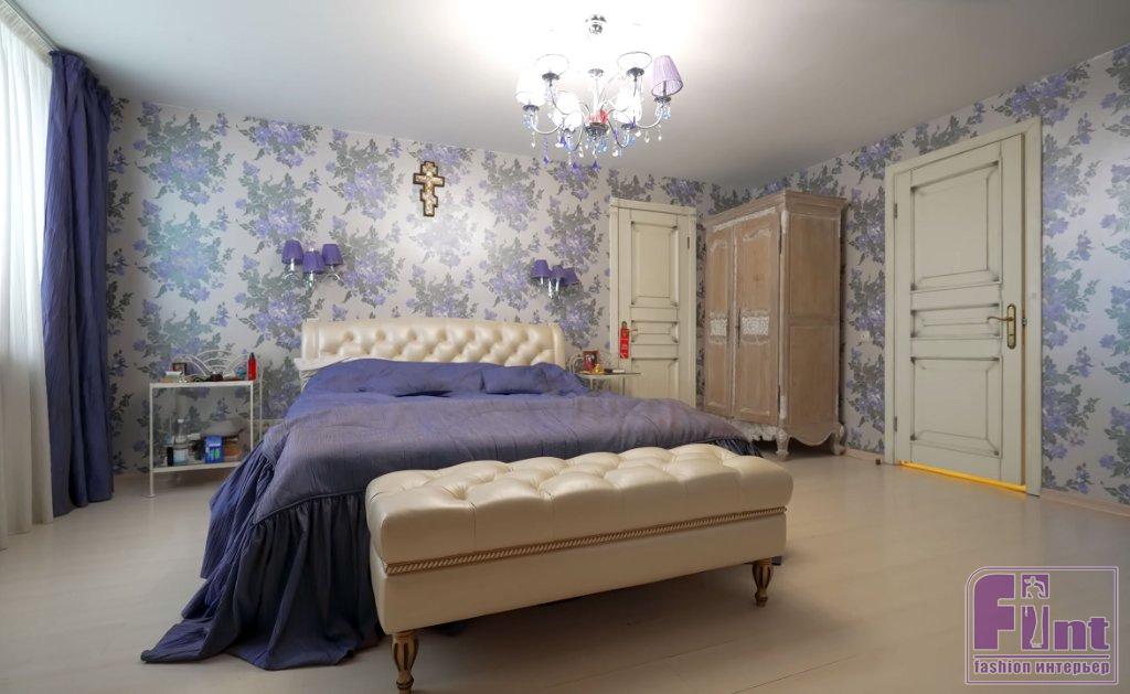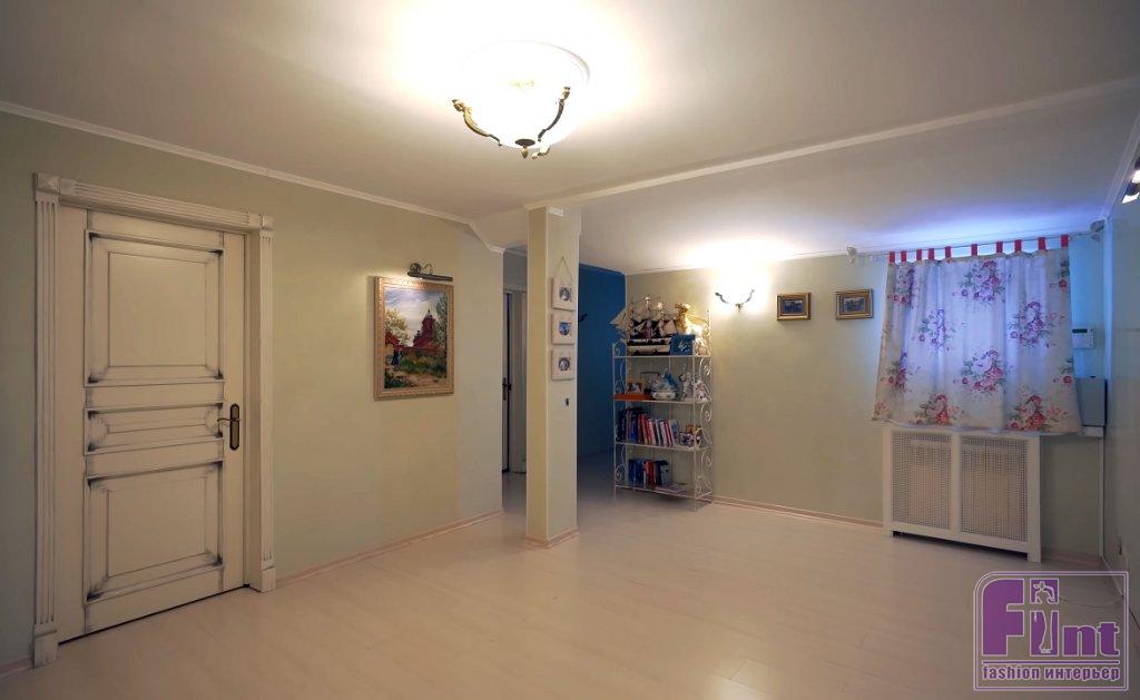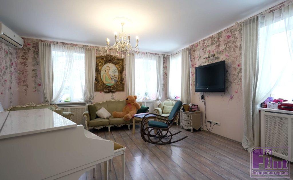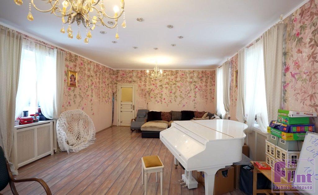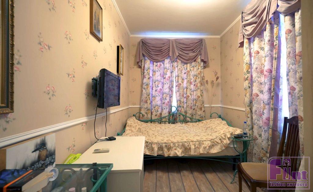 Как и в кухне, и в столовой, в гостиной сразу бросаются в глаза нотки прованса в интерьере. Обои на стенах здесь тоже бежевые, с розовым цветочным орнаментом, и тот же принт прослеживается на портьерах, составляющих красивые комплекты с белым тюлем.