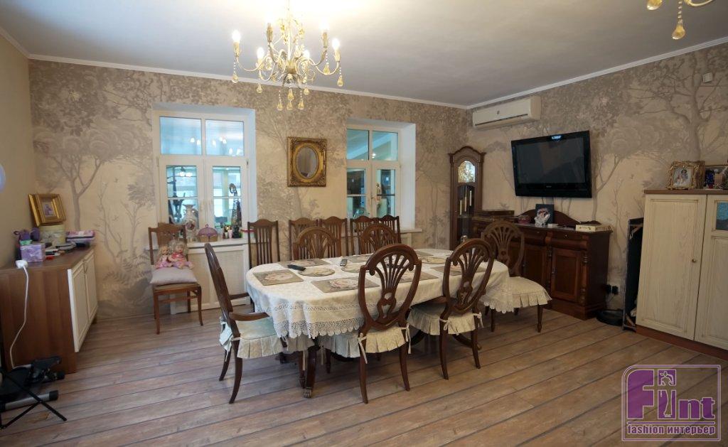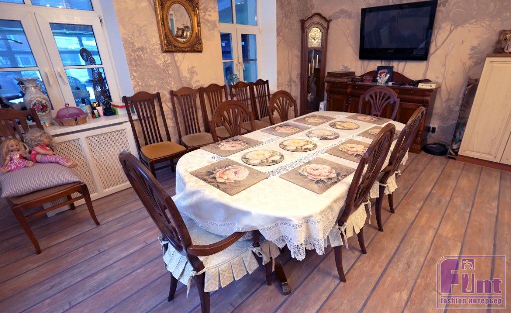 Интерьер столовой перекликается с обстановкой в кухне, как бы продолжая флористическую тематику. Кроме тех же обоев, рисунок розовых и алых роз повторяется в чехлах для стульев, расставленных у большого овального обеденного стола, а также в ламбрекенах на окнах. Стол покрыт красивой скатертью бежевого цвета, а пол выстелен светло-коричневой лакированной дубовой доской. Так как Алла Довлатова часто приглашает в гости друзей-музыкантов, в столовой стоит белый рояль, который декорирован живыми растениями, цветами, фотографиями в рамках.