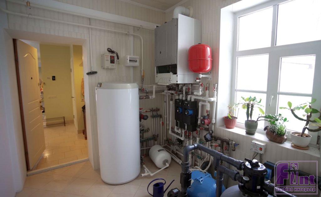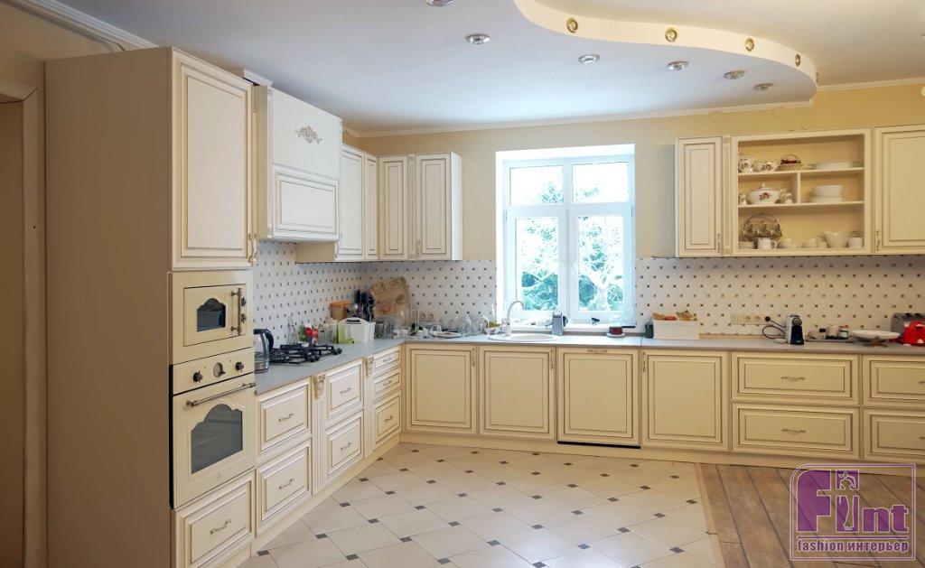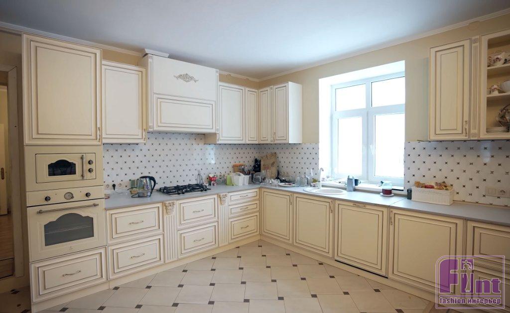 В большинстве помещений в доме Аллы Довлатовой уложен теплый пол, что позволяет чувствовать себя комфортно в любое время года. В роли напольного покрытия кухни в доме Довлатовой выступает керамическая плитка под дерево с уникальным узором. Мебель из массива древесины искусственно состарена, фурнитура подобрана под стать ей – она классической формы, и сделана из латуни. Кухонный фартук выложен бежевой плиткой чуть темнее столешницы из кварцевого агломерата. С фасадами шкафчиков отлично сочетаются светлая вытяжка и огромный холодильник, а со стенами – шторка на окне.