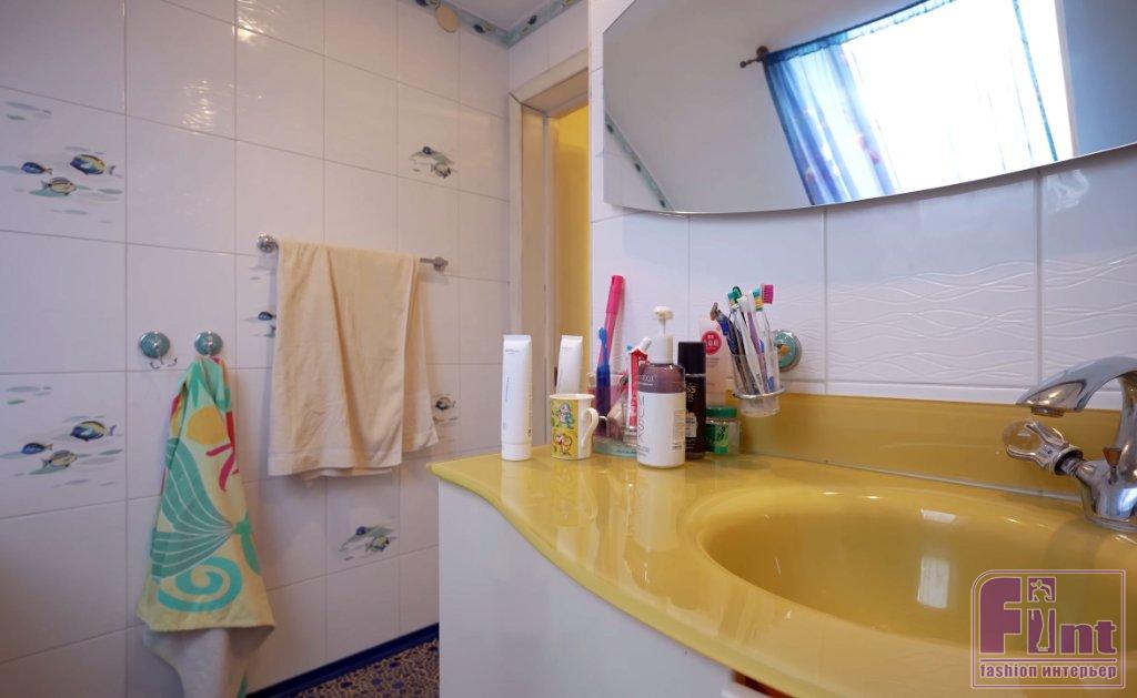 Цветы присутствуют и в декоре ванной комнаты Аллы Довлатовой. Для оформления этого помещения она выбрала красивое сочетание белого кафеля и плитки с красными маками. Тот же рисунок присутствует на шторе, которая скрывает окно в ванной. Нижний ряд кафеля в помещении зелёный, как и пол в комнате, что создает ощущение настоящего макового поля. Мебель в ванной нежно-бирюзового цвета, коврики – изумрудные, над умывальником навешено большое зеркало в бирюзовой раме. В целом помещение просторное и комфортное, но совершенно лишено показной роскоши.