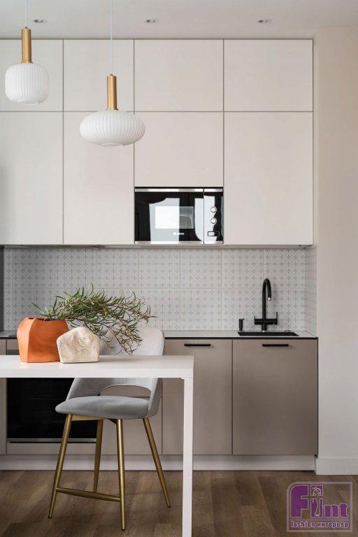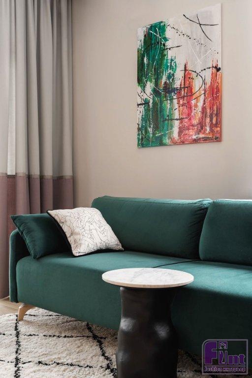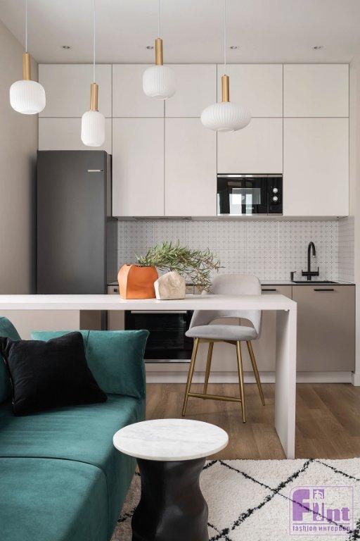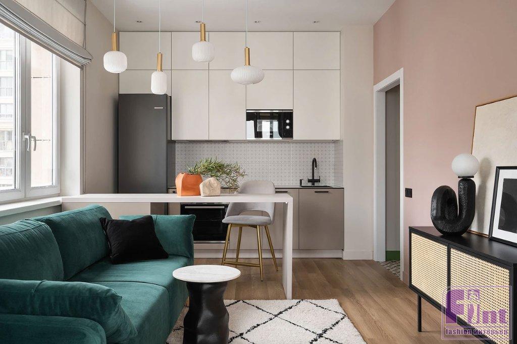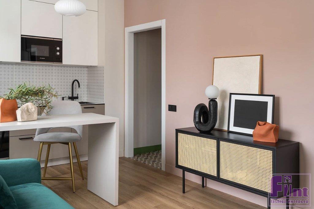 Главный «герой» кухни-гостиной — зелёный диван. «Когда я открыла референсы от заказчиков перед работой, то обнаружила для зоны гостиной только зелёный диван, — улыбается Мила. — Это было смешно, до сих пор вспоминаем об этом с ними, они даже торт подарили мне в завершении именно с зелёным диваном». Кухонный гарнитур же сделали пыльно-розовым. Встроили всю нужную технику, только холодильник выбрали не встраиваемый, однако он отлично «встал» в линию к кухне и не привлекает к себе внимания. В том числе за счет того, что над ним сделан шкаф. На балконе обустроено рабочее место. Подвесной рабочий стол зелёного цвета — сам по себе акцент.