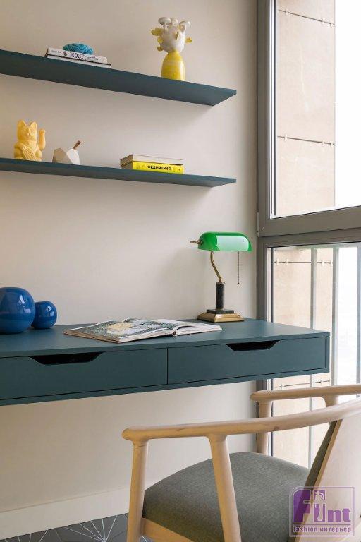 «В каждом помещении доминирует свой цвет или сочетание цветов, но все они объединены между собой, и за счет того, что фон основных стен всё-таки белый, акценты смотрятся уместно и не вычурно, — продолжает Мила. — Основные оттенки у нас: зелёный, синий (голубой) и оранжевый (терракотовый или розовый, как в кухне-гостиной)».