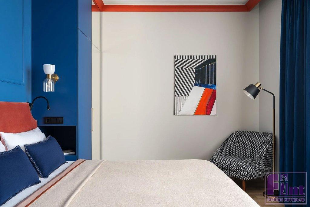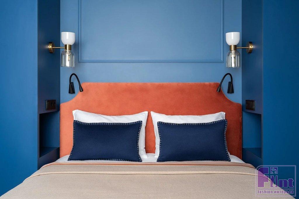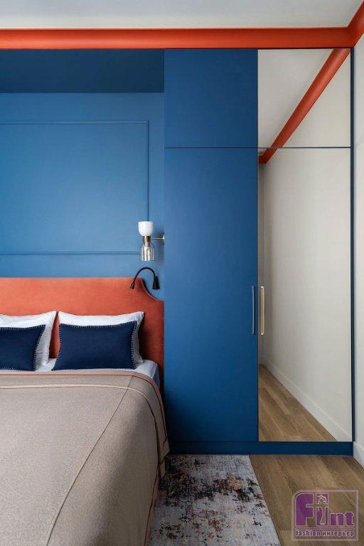 Запрос заказчиков на вместительные системы хранения дизайнер воплотила с точностью. В прихожей выделили гардеробную, где можно хранить самые разные вещи и хозяйственные принадлежности. Вдоль всей стены в прихожей также встроен шкаф. В спальне — два шкафа. Они размещены по бокам от кровати и распределены равнозначно: один шкаф — для вещей супруги, второй — для супруга. Дизайнер сделала шкафы в цвет синей стены и с зеркальными фасадами, что не только функционально (в спальне должно быть зеркало, чтобы оценить внешний вид перед выходом), но и визуально расширяет пространство. Кровать терракотового оттенка — отличный «партнёр» синим стенам и мебели.