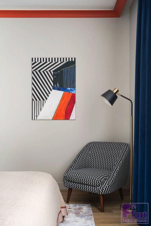 Общий свет в виде точечных светильников и люстр и дополнительный — в виде подвесов над барной стойкой, бра по бокам от кровати и зеркала в прихожей, настольной лампы в ретростиле на рабочем столе — дизайнер реализовала разнообразные сценарии света. «Я, в целом, работаю в современном стиле, но моя отличительная особенность как дизайнера — это работа с цветом в интерьере, а именно раскрытие заказчика через цвет. Я пропагандирую то, что каждый человек, даже далекий от искусства и понимания его, может жить в ярком интерьере, и это не надоест никогда, потому что можно подобрать цвета, соответствующие его внутреннему миру. Хочется обратить внимание на картину над диваном, это моё авторство, написанное специально под заказчиков и под их интерьер, это мой подарок им от души», — дополнила рассказ о проекте Мила.
