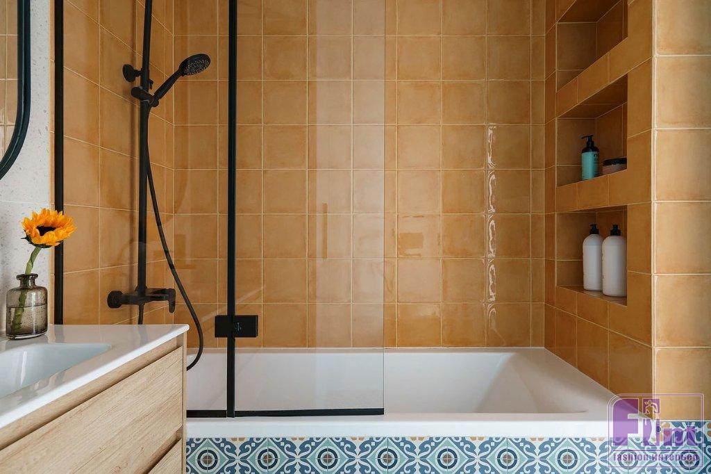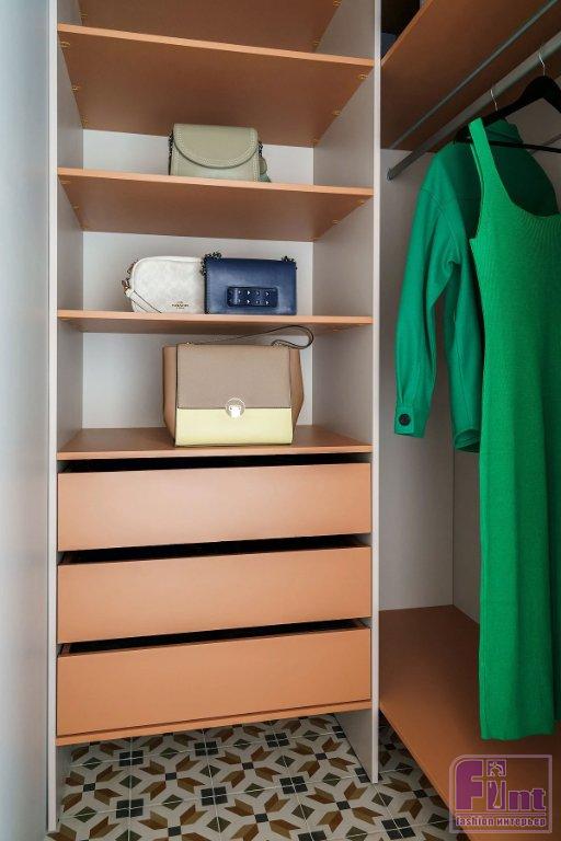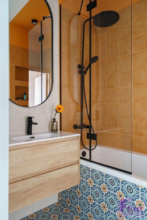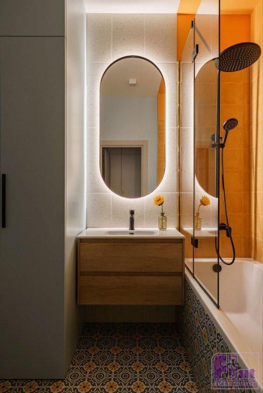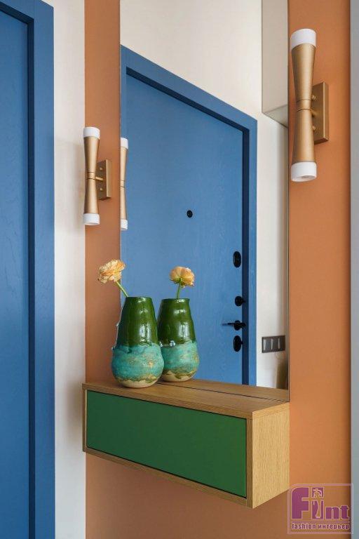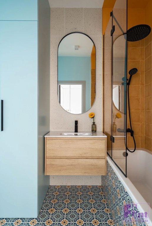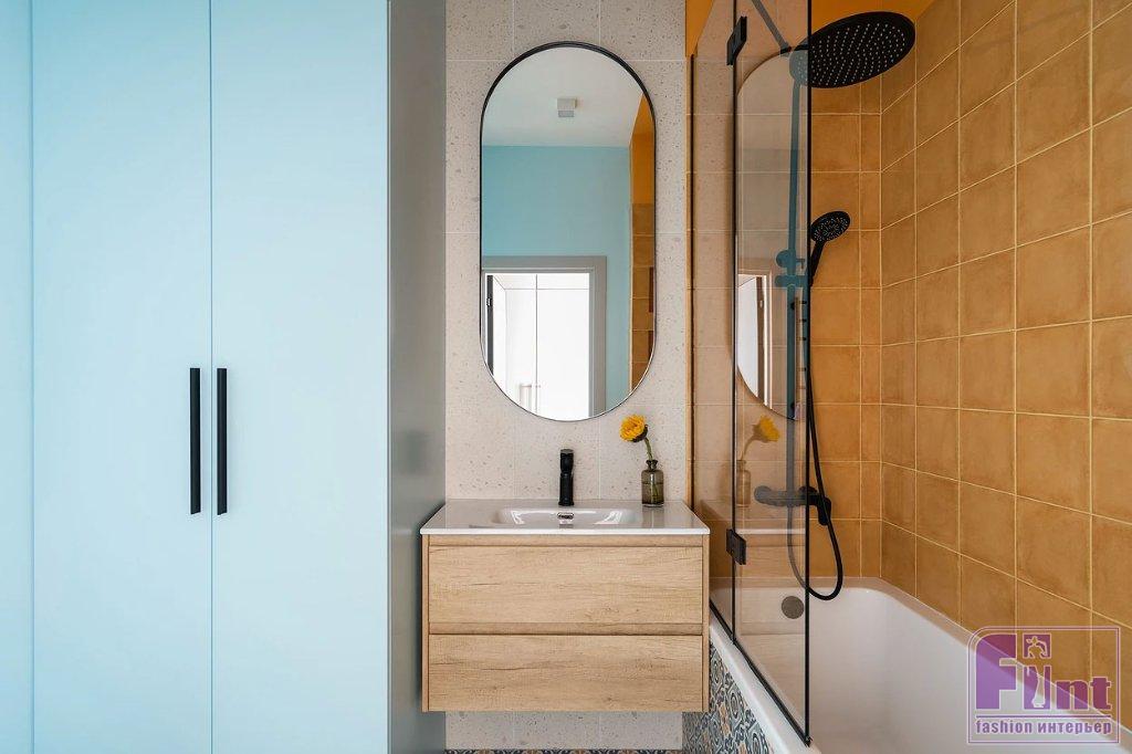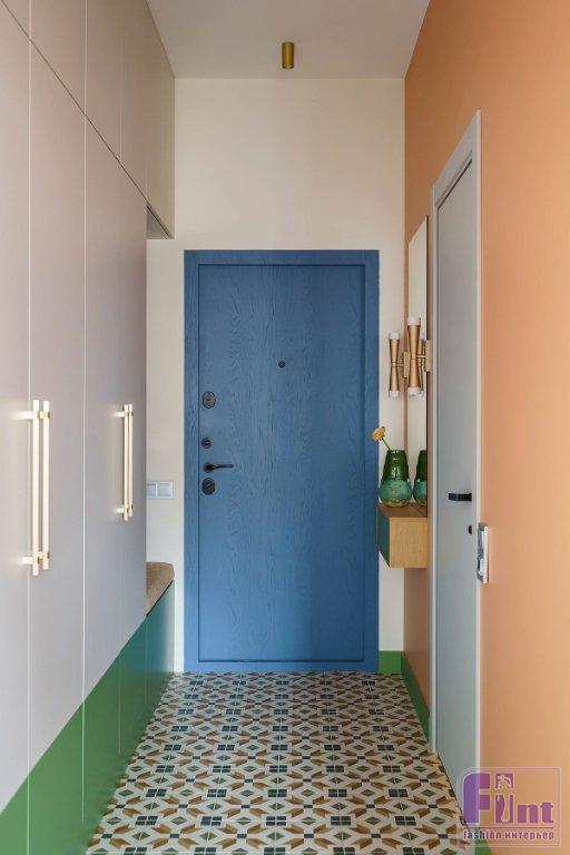 Хозяева были не против яркого цвета, а Мила умеет и любит работать с такими задачами. В качестве фона выбрали светлую краску. На полу в кухне-гостиной и спальне уложили кварцвинил. Одна из стен в прихожей окрашена в пастельный оранжевый цвет. Этот оттенок продолжен в гардеробной, ванной комнате. Для нижней части шкафа использовали зелёный. На полу в прихожей и гардеробной уложен керамогранит с геометрическим рисунком, где «собраны» все цвета входной зоны. В спальне в качестве акцента использовали синий. Таким способом выделили стену в изголовье кровати, и в том же оттенке сделали встроенные шкафы. В ванной комнате скомбинировано три вида плитки и краска. В зоне ванны — оранжево-жёлтая квадратная плитка. В зоне тумбы с раковиной — нейтральная плитка с рисунком терраццо.