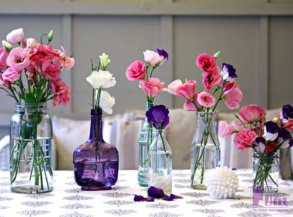 Сейчас в тренде минималистичный декор, поэтому для свежих букетов или сухоцветов не обязательно подбирать сложные вазы. Можно купить недорогие аксессуары в виде гладких или рельефных бутылок, или сделать самостоятельно из того, что есть у вас дома. Подойдут как обычные стеклянные ёмкости, так и какие-то интересные бутылки. Все что нужно — избавить их от этикеток и украсить по желанию. То же самое относится к стеклянным банкам нестандартных форм.
