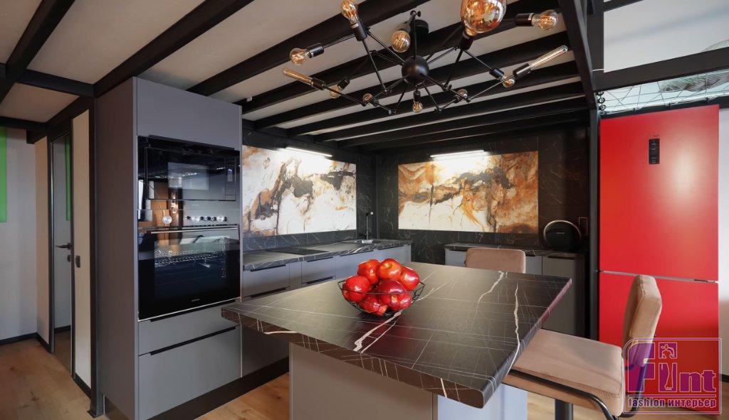 Роль кухонного фартука при Г-образной планировке кухни Лущикова исполняют два огромных цельных полотна керамогранита. Они обрамлены антрацитовыми плитками из аналогичного керамогранита, что создаёт эффект двух картин на фартуке. Эффект «картин» усиливает подсветка, установленная над полотнами керамогранита. Своеобразным пограничным столбом территории кухни выступает большой двухкамерный холодильник ярко-красного цвета. Он фактически установлен на площади гостиной, замыкая кухонный блок. Объединяет зону кухни-гостиной напольное покрытие, выполненное из практичного кварцвинила. Эта же кварцвиниловая плитка уложена не только на первом, но и на импровизированном втором этаже, и даже на небольшом участке стены за лестницей на второй этаж.