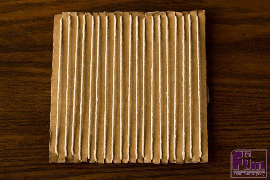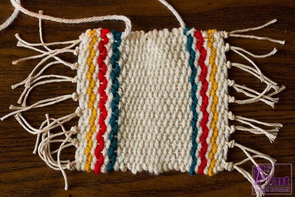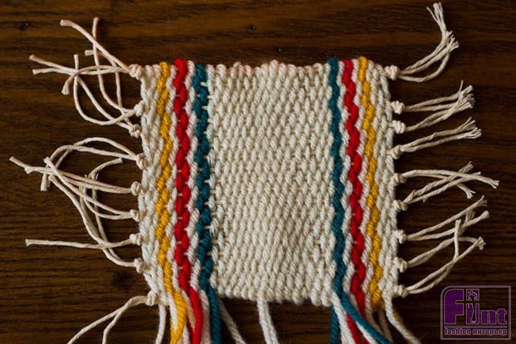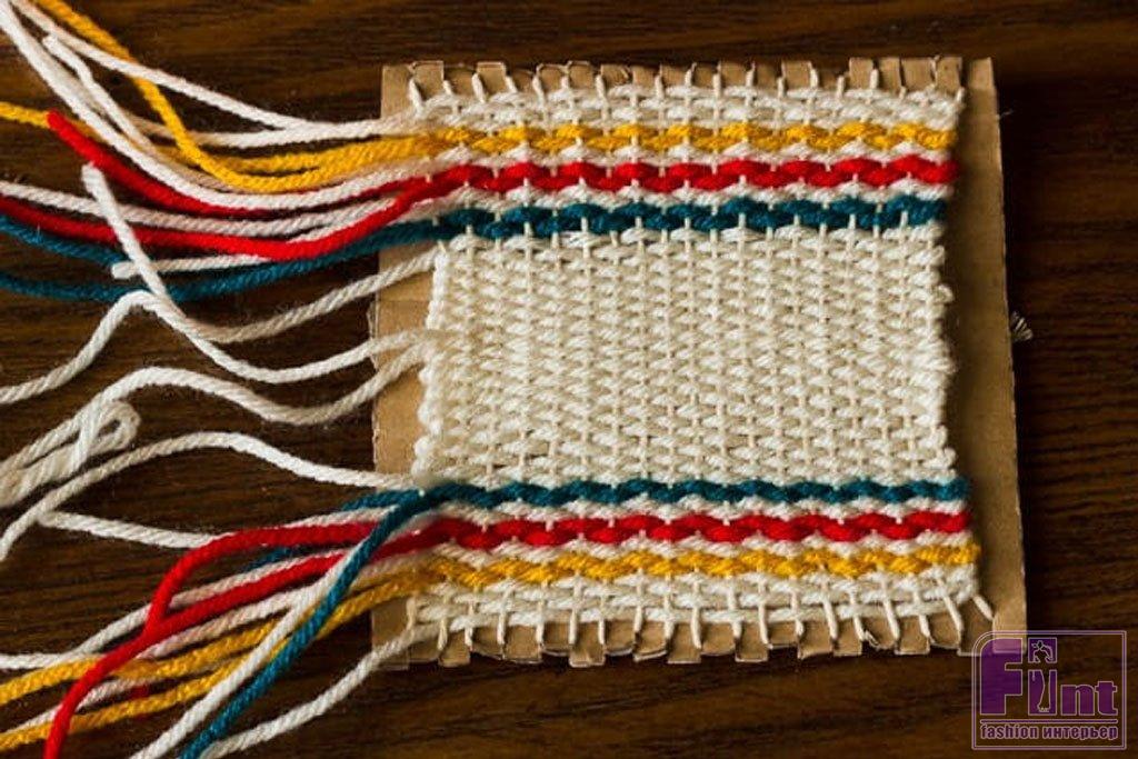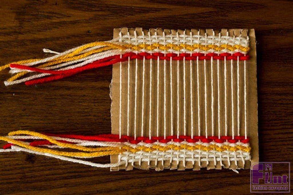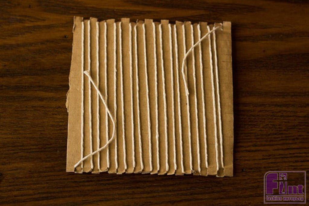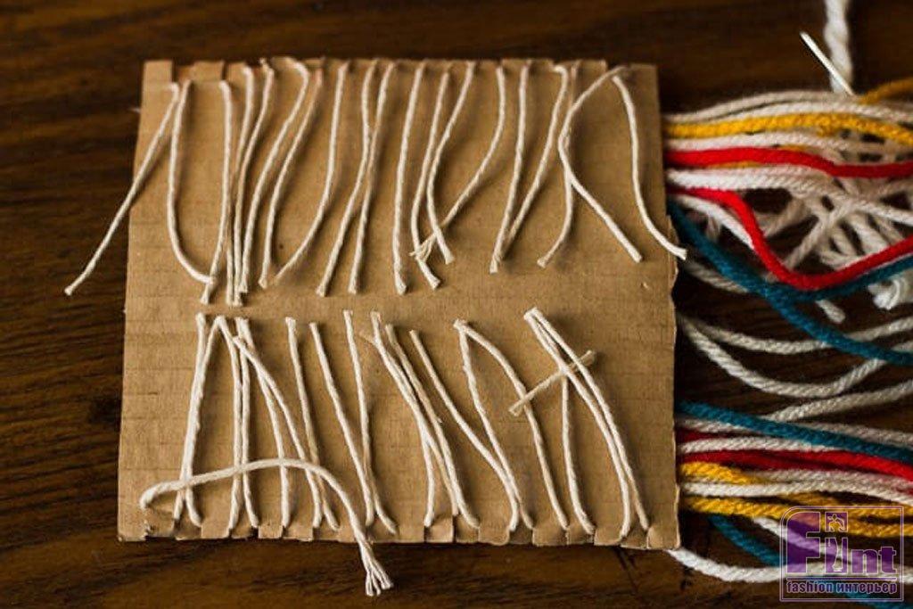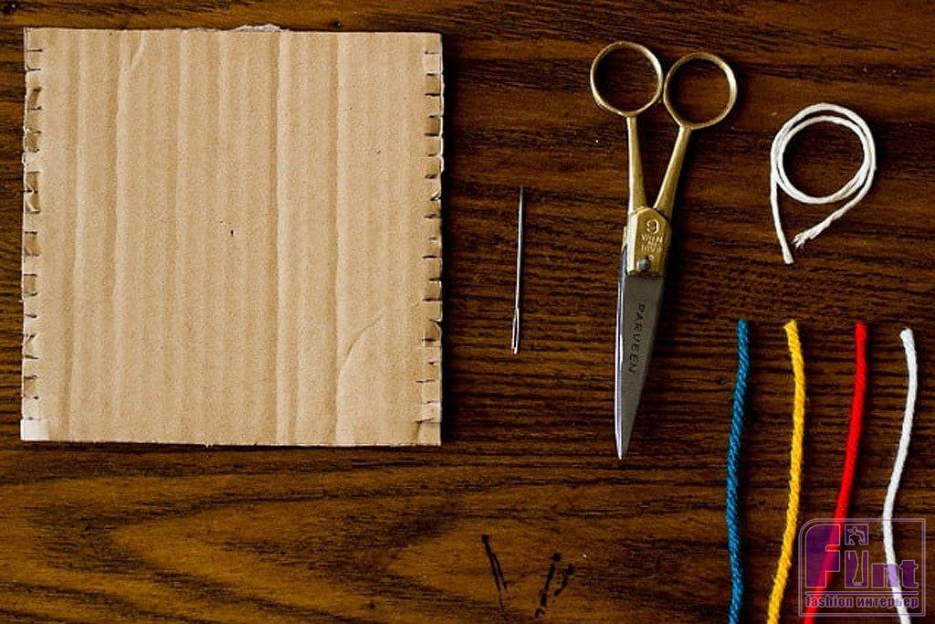 Для того чтобы сделать своими руками эти удивительные плетёные коврики-подставки в этническим стиле, вам понадобится всего несколько мотков пряжи и кусок картона, который несколькими простыми действиями мы превратим в импровизированный ткацкий станок.