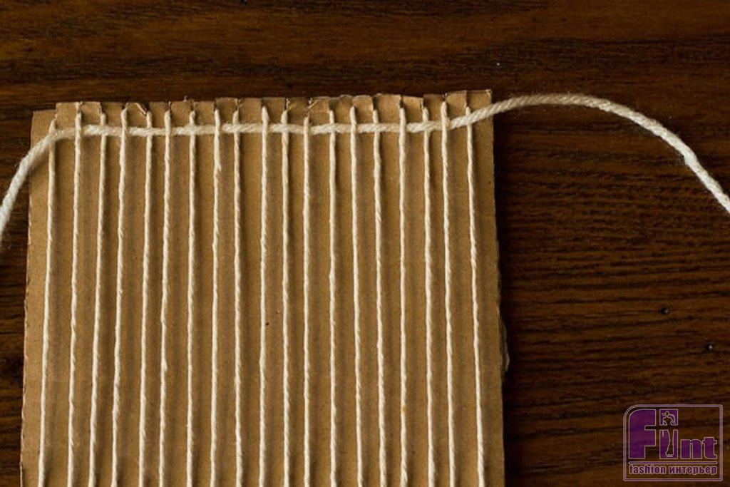 Переверните картон на обратную сторону, где вы увидите изнаночную часть нитей основы, и разрежьте шпагат посередине.