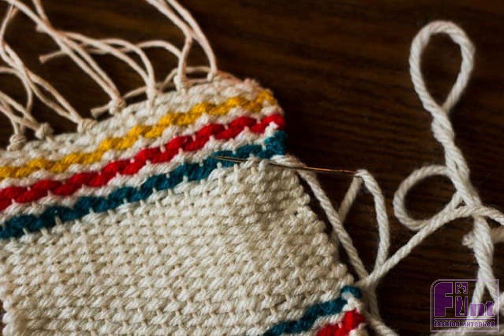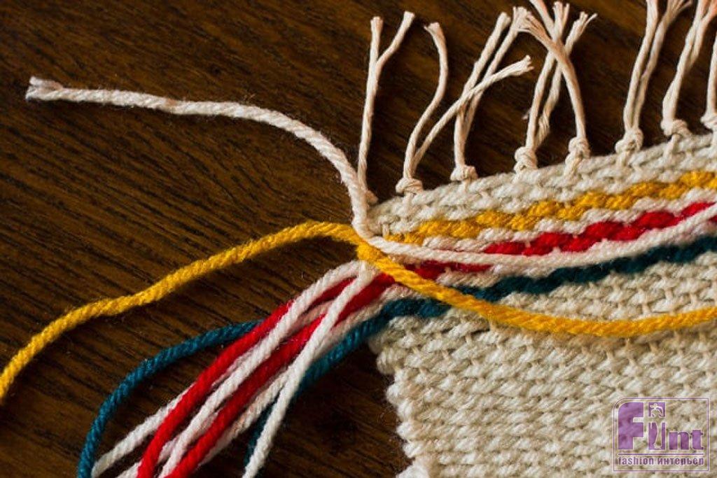 Чтобы закрепить пряжу по краям коврика и избежать распускания тканого полотна, вы можете просто завязать узлы по краям изделия, отрезав излишки пряжи с помощью ножниц.