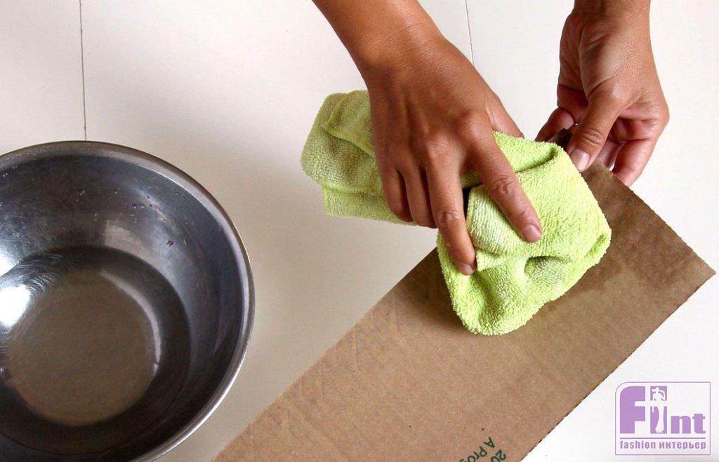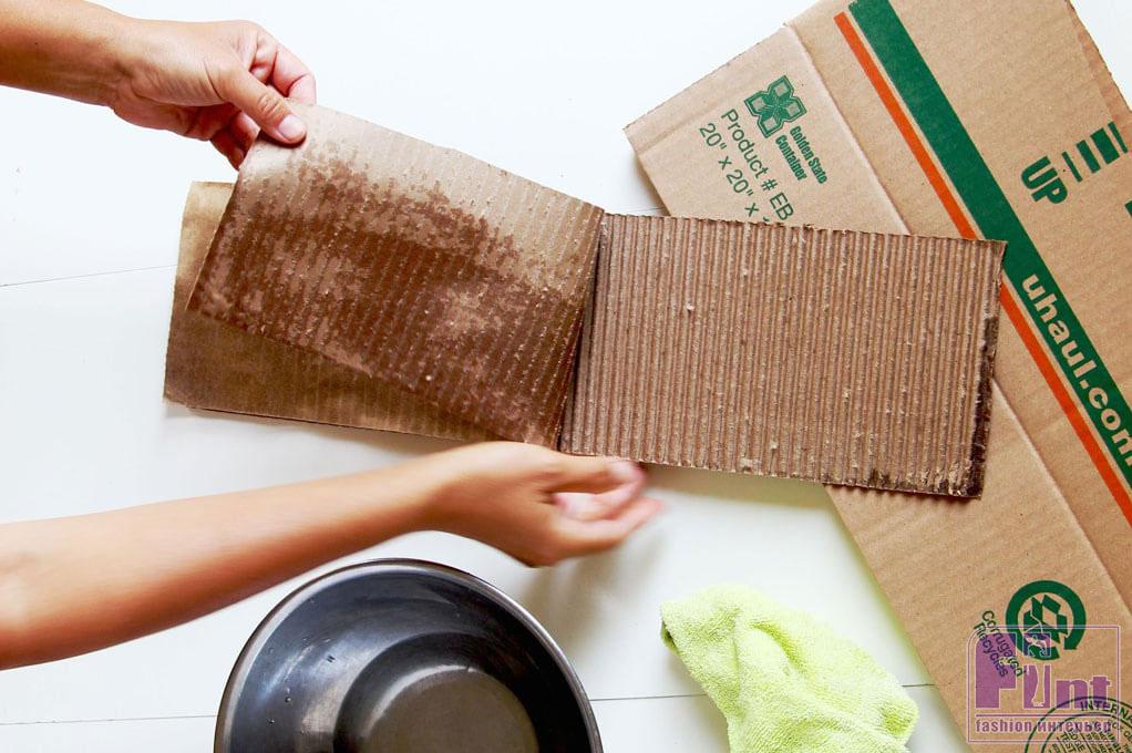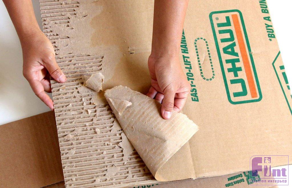 Подготовьте гофрированный картон. Отделите гладкий слой картона, чтобы открыть его рифлёную поверхность. Некоторые виды картона хорошо разделяются на слои, но для других видов может потребоваться небольшое увлажнение. Используя влажную тряпку, протрите одну сторону картонной поверхности, подождите 30 секунд и снимите влажный слой. Он довольно легко отслаивается, и это совсем не занимает много времени. Нам нужно отслоить только одну сторону гофрированного картона.