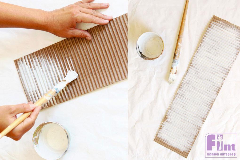 Окрашивание картона мы будем делать на примере более светлого варианта. Базовый слой краски на фото выглядит белым, но на самом деле это смесь белой акриловой краски с небольшим количеством чёрной, чтобы создать светло-серый цвет.