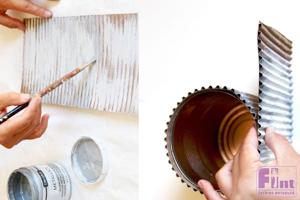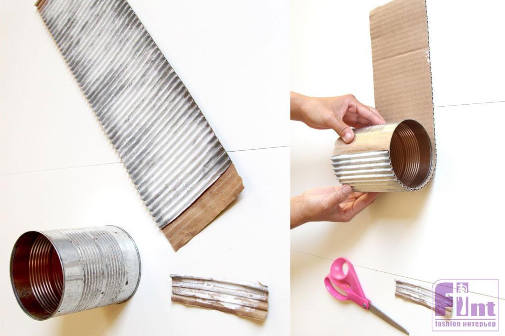 Завершающим шагом оберните покрашенный картон вокруг банки и зафиксируйте его с помощью клея для рукоделия. Если вы планируете использовать консервную банку для других проектов, просто склейте края картона. В этом случае картонный «рукав» будет легко сниматься с банки. Готово!