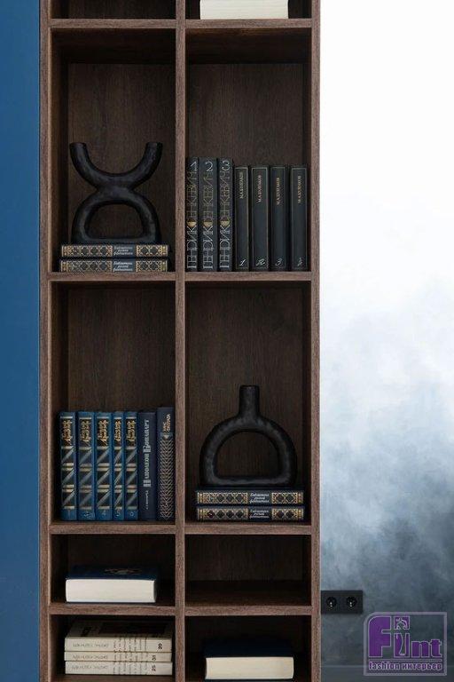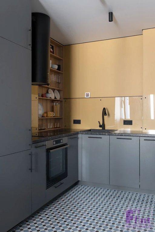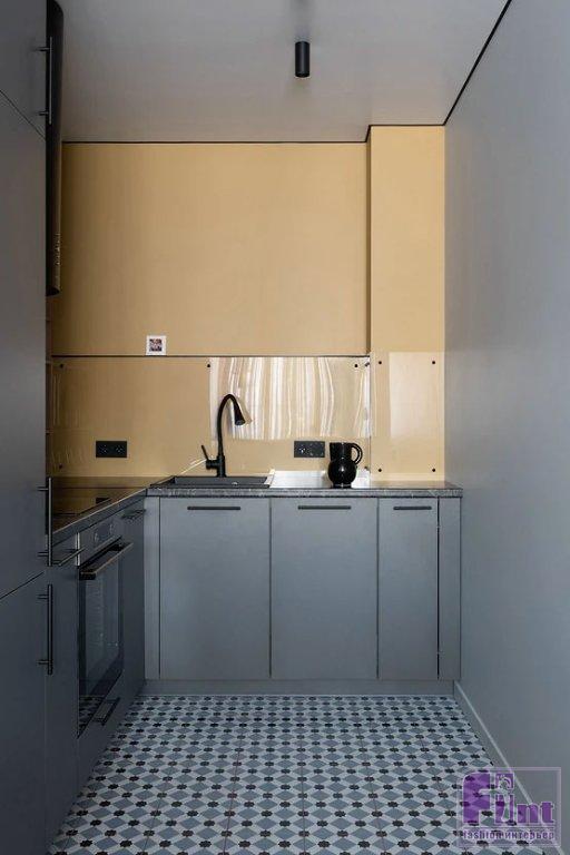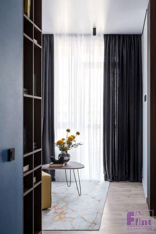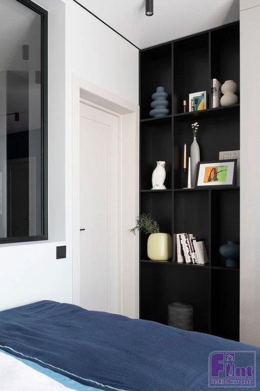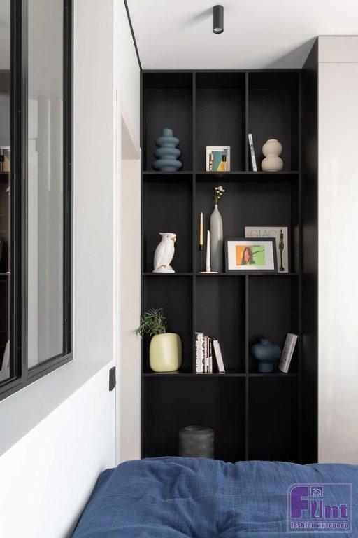В прихожей встроили большой шкаф для верхней одежды. Для мелочей — консоль. В гостиной — ещё один шкаф, где одна из секций сделана в виде открытых полок для хранения книг и декора. В спальне тоже поместился шкаф, встроили стеллаж для книг. У кровати было место только для одной тумбочки, так как она стоит вплотную к перегородке с окном. Но в перегородке предусмотрели нишу-полку. На кухне отказались от верхних шкафов, рассудив, что молодая девушка вряд ли будет много готовить и держать большое количество посуды. В нише, которая была по плану от застройщика, сделали открытые полки. В нижние базы встроили духовой шкаф, посудомоечную машину. Холодильник тоже встроенный. От плитки на фартуке отказались, закрыв стену над рабочей поверхностью закалённым стеклом.