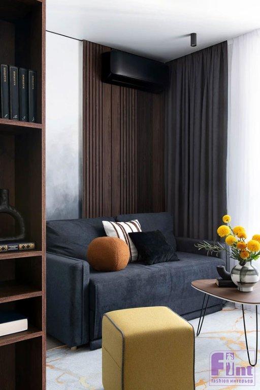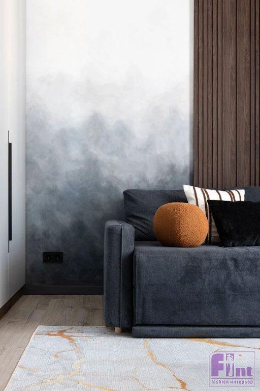 «Хотелось создать что-то простое, не очень дорогое и в то же время дизайнерское, с изюминкой. Самым интересным моментом было рисование стены в зоне дивана художницей. Это была ручная работа и поэтому неповторимая», — дополняет рассказ о проекте его автор.