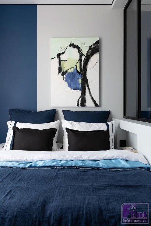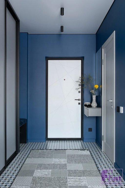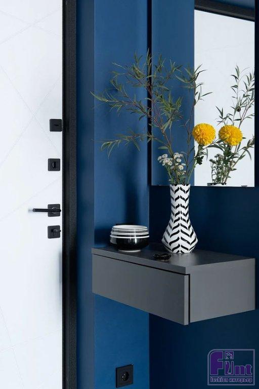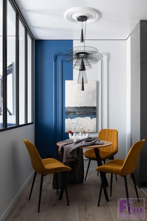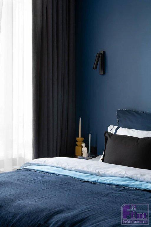 Для отделки стен выбрали краску. Скомбинировали белый цвет и глубокий синий. В гостиной на стене за диваном — роспись, сделанная художницей — «дымка», которую удалось реализовать растяжкой от тёмной краски к светлой. Там же монтированы настенные панели под дерево. Стены в гостиной и спальне украшают молдинги и лепной декор. Стена на кухне выделена горчичным цветом. На полу в комнатах и столовой зоне уложен ламинат. Для прихожей и кухни выбрали плитку с мелким рисунком. В санузле использовали керамогранит под дерево на полу и стене душевой, а на стенах скомбинировали керамогранит под бетон и под камень с эффектом патины в душевой и зоне инсталляции унитаза.