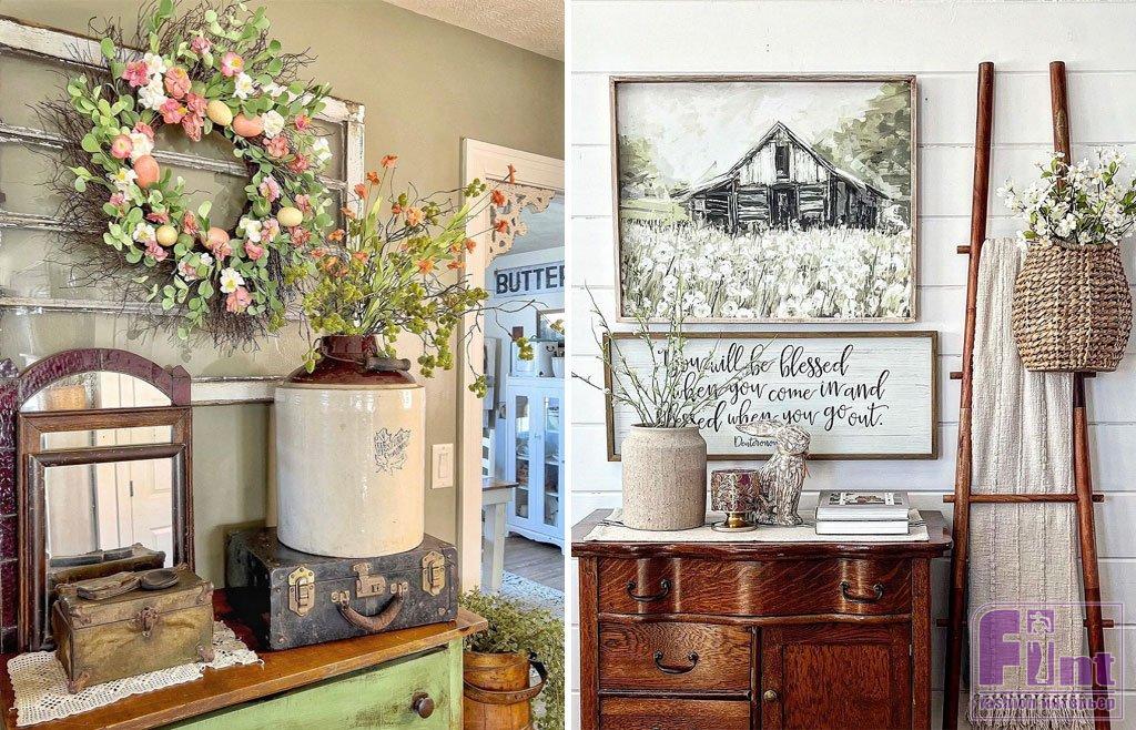 Ощущения, будто вы в благоухающем весеннем саду, можно добиться, скомбинировав винтажные вещицы с живыми цветами. Располагайте такие инсталляции на комодах, тумбах или открытых полках. В качестве ретроэлементов можно взять старинные шкатулки, чемоданы, зеркала, различные деревянные фигурки, бидоны. Как раз последние хорошо будет использовать для цветов вместо обычных ваз.