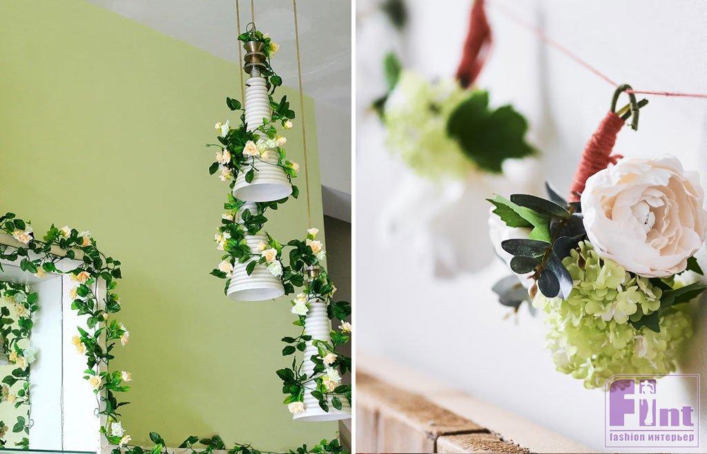 Ещё один способ добавить в интерьер цветочное настроение — развесить гирлянды или венки из цветов. Вешайте их просто так в качестве настенного декора или обрамляйте зеркала и другие элементы интерьера. Преимущество такого декора в том, что его можно сделать своими руками. Уникальные рукотворные аксессуары часто смотрятся лучше покупных, которые есть у многих дома. Изготавливайте гирлянды из бумаги, ткани, фетра и любых материалов, на которые хватит фантазии.
