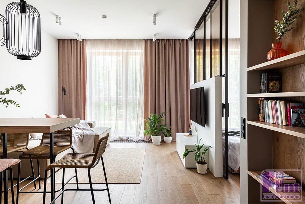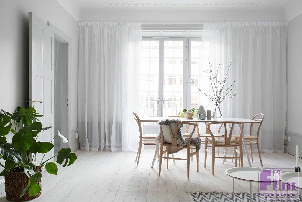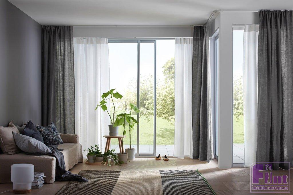 Уже несколько лет один из самых трендовых вариантов применения прозрачных занавесок — использовать их самостоятельно. Этот приём хорош тем, что окно остается более открытым, в комнату проникает больше естественного света — это важно и для маленьких, и для больших пространств. Чтобы находиться в помещении было комфортно, лучше выбирать тюль из более плотной ткани: того же льна или, например, шифона.