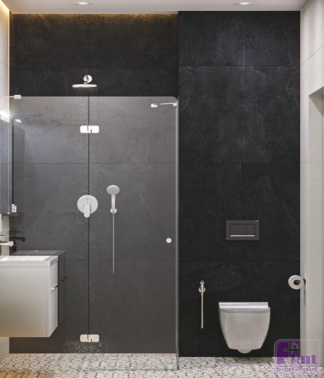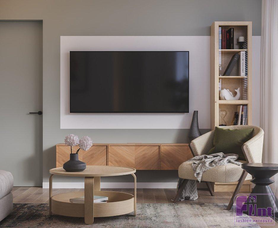 В гостиной установили удобный раскладной диван. Под телевизором есть тумба, где также можно разложить мелочи. В ванной комнате — тумба под раковину с двумя выдвижными ящиками. В зоне душа сделаны полки-ниши для того, чтобы было удобно ставить разные ёмкости с гелями и шампунями.
