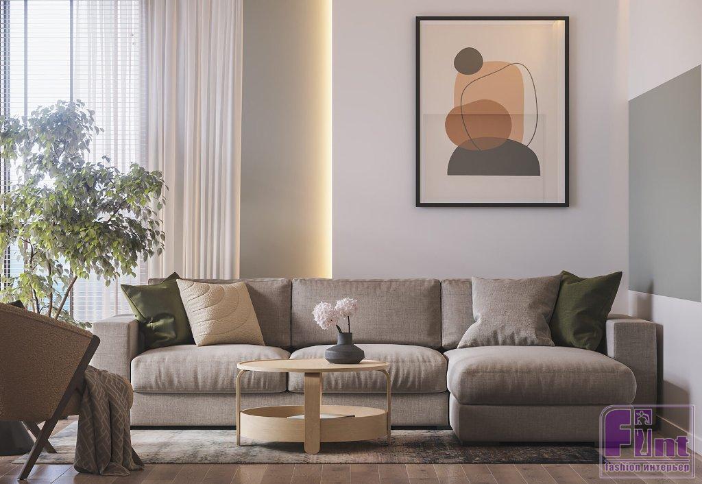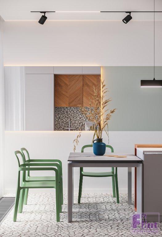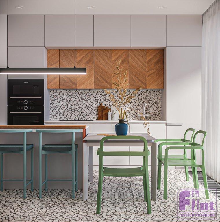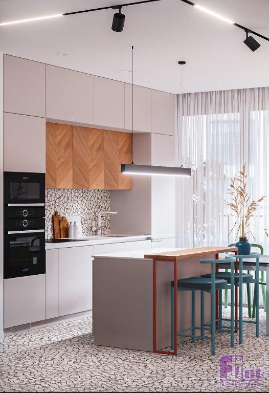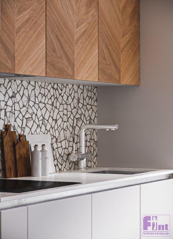 На полу в прихожей, на кухне и в санузле уложен керамогранит под терраццо. Его же использовали на кухонном фартуке, чтобы создать визуальную гармонию пространства. В спальне и гостиной на полу — инженерная доска. Медовый оттенок дерева придал пространству необходимую нотку уюта. В санузле на стенах скомбинировали керамогранит под серый и тёмный бетон.
