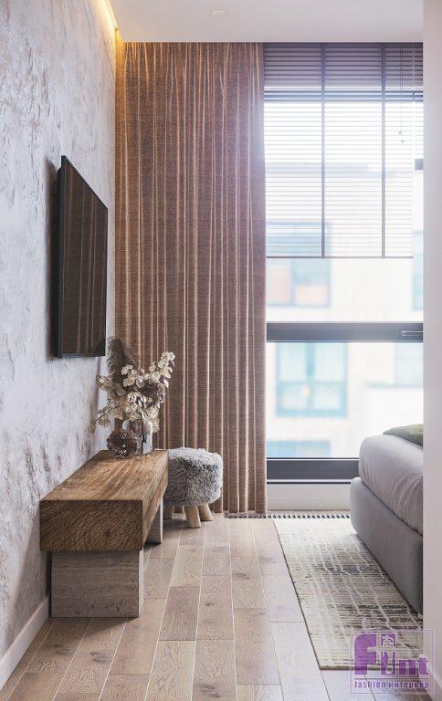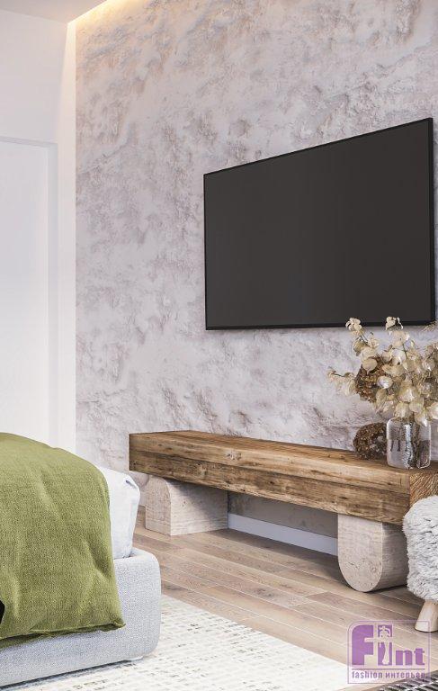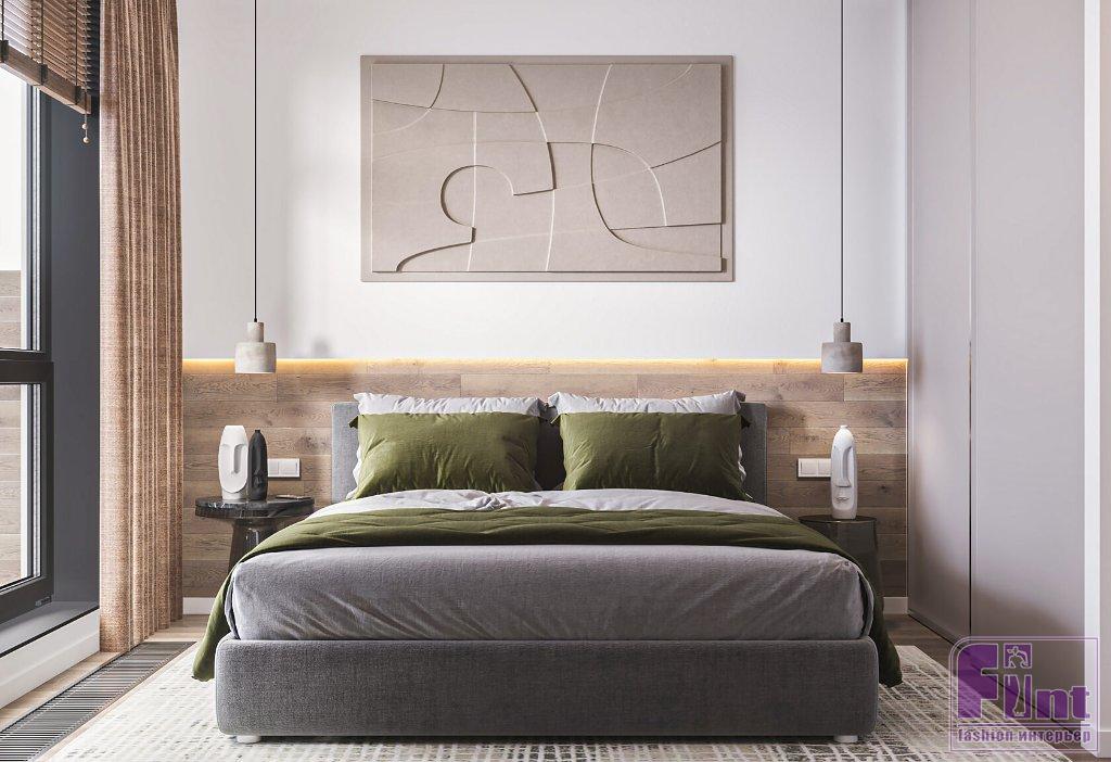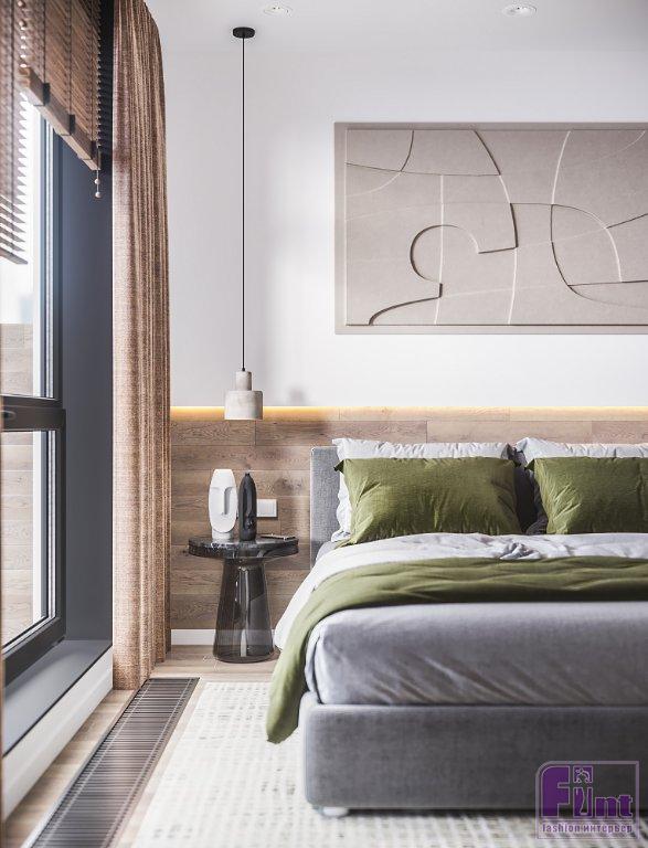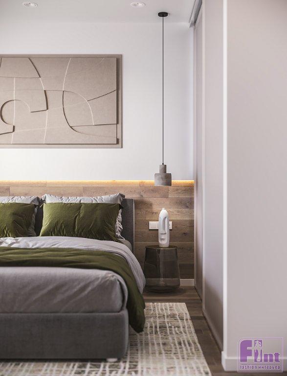 В качестве базового цвета выбрали светлый оттенок краски и использовали его во всех помещениях, что визуально их объединило и добавило лёгкости интерьеру. В спальне напротив кровати для акцента выбрали декоративную штукатурку, а за изголовьем кровати нижнюю часть стены оформили деревянными панелями. «Это, безусловно, придаёт немного брутальности лёгкому интерьеру», — рассказывает Алексей.