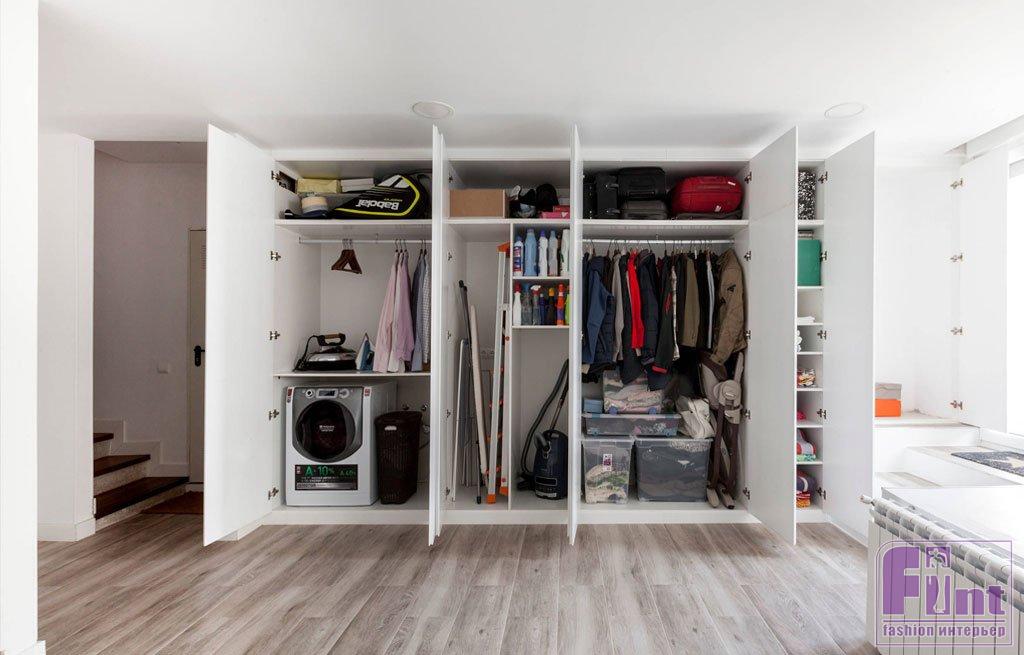 Вопрос также можно решить на этапе планирования интерьера: попросите дизайнера сделать отсек хранения, в который у вас будет удобный доступ. Ещё один способ — встроить гладильную доску в шкаф, чтобы она не захламляла пространство. Или поменять привычный утюг на парогенератор — тогда вы сможете приводить вещи в порядок прямо на вешалках.