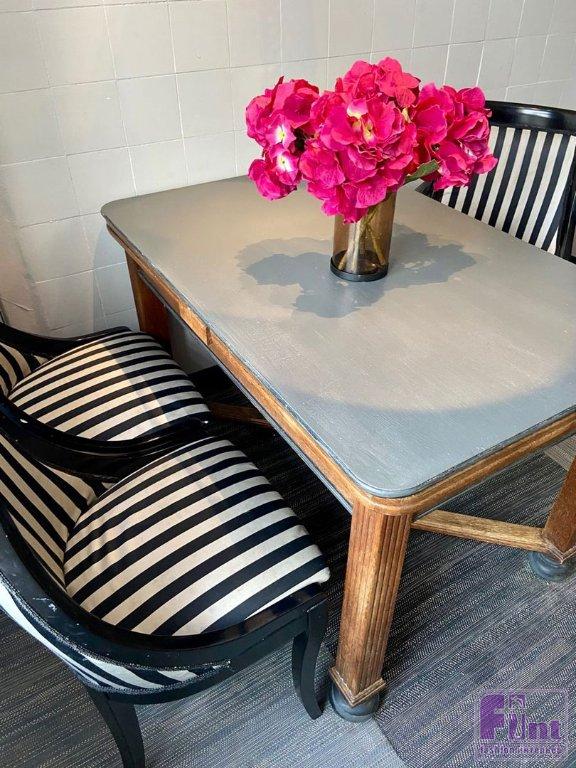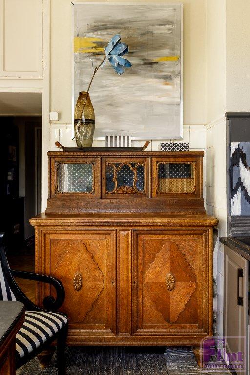 Местом для приема гостей служит кухня. Решив сохранить дух сталинской квартиры, Алёна и Павел отреставрировали деревянное окно, покрасили советскую плитку в светло-серый оттенок и привели в порядок старый стол. На кухне также нашлось место для винтажного буфета. Его Павел протёр смесью уксуса и масла и покрыл сверху кокосовым маслом. Кроме того, хозяева квартиры оставили антресоли в коридоре и восстановили оригинальный паркет.