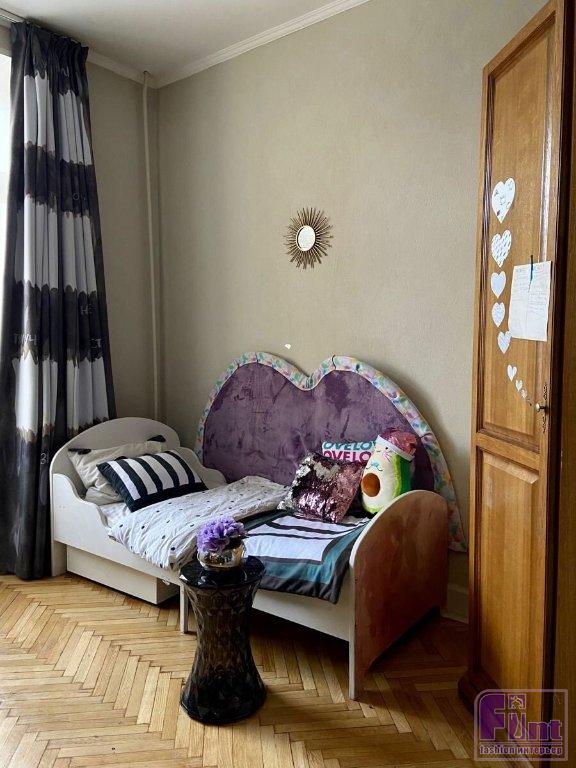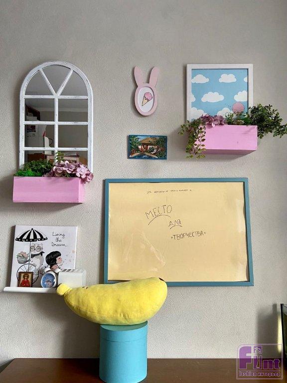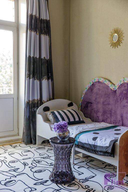 Кровать в детской подчёркивает необычное изголовье, которое Алина сделала сама из материала для шумоизоляции, куска покрывала и цветной шторы. По форме изголовье напоминает пухлые губы, облепленные по краю конфетами монпансье. Текстиль в интерьере тоже авторский. Когда Алину в прошлом году пригласили на строительную выставку в качестве участника, она решила придумать текстиль, который могла бы потом использовать у себя в интерьере. Красками и фломастерами Алёна нарисовала на бумаге шторы, покрывало и подушку и отсканировала. Графический дизайнер Роберт Казаков перевёл рисунки в «цифру», а дизайнер Виктория Куприянова вместе со своей компанией распечатала ткань и сшила предметы по эскизам. Она решила сделать шторы ультраплотными, поэтому дополнила их подкладкой из ткани блэкаут. Если внимательно присмотреться к шторам, то на них можно разглядеть зашифрованный текст: «тот, кто услышит шёпот своего сердца, получит несметные богатства и жизнь в радости».