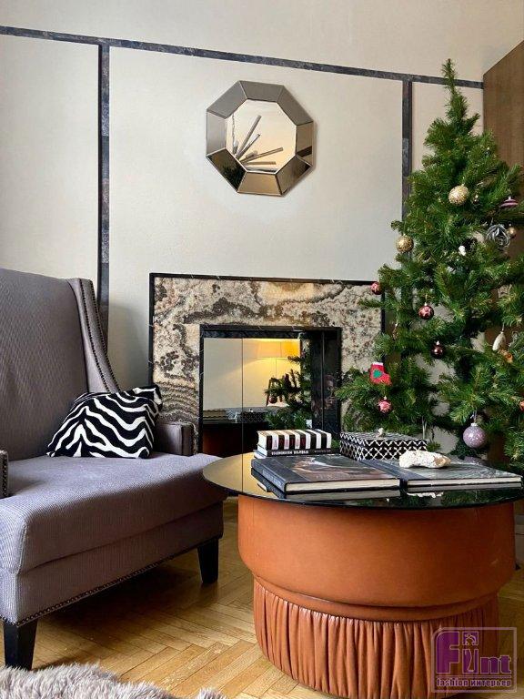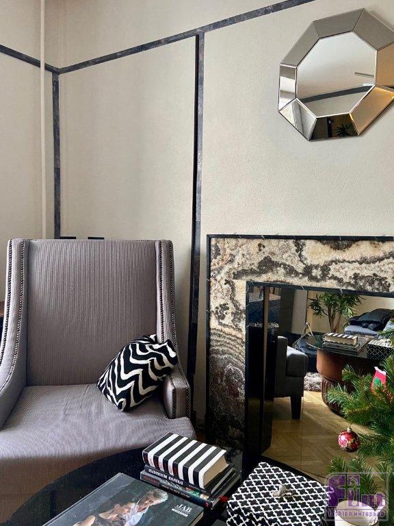 Дизайн интерьера своей квартиры Алёна Санаева, которая является профессиональным дизайнером интерьеров, разработала и реализовала сама. Оригинальную планировку супруги решили не менять. В квартире есть две комнаты с балконами, выходящими на противоположные стороны, небольшая кухня и санузел. Логично, что комната при входе — это гостиная. Но поскольку квартира по своей планировке является классической «двушкой», организовать полноценную гостиную было негде, а спать на диване хозяевам не хотелось, поэтому прямо около входа была оборудована спальня. Кровать Алёна скрыла от посторонних глаз и организовала каминную зону, которая видна из прихожей. Торжественности интерьеру придают тёмные оттенки и сочетание материалов с разнообразными текстурами.