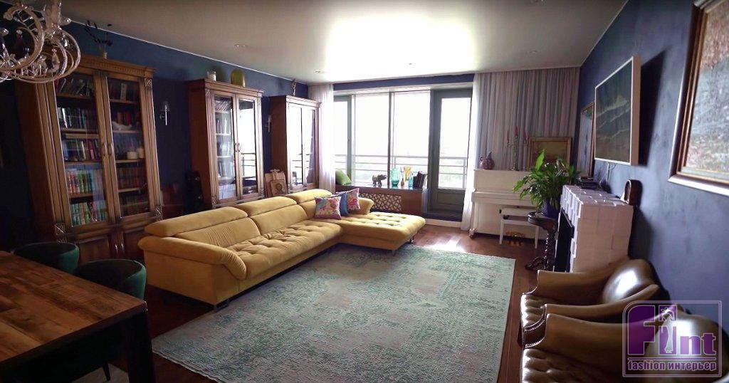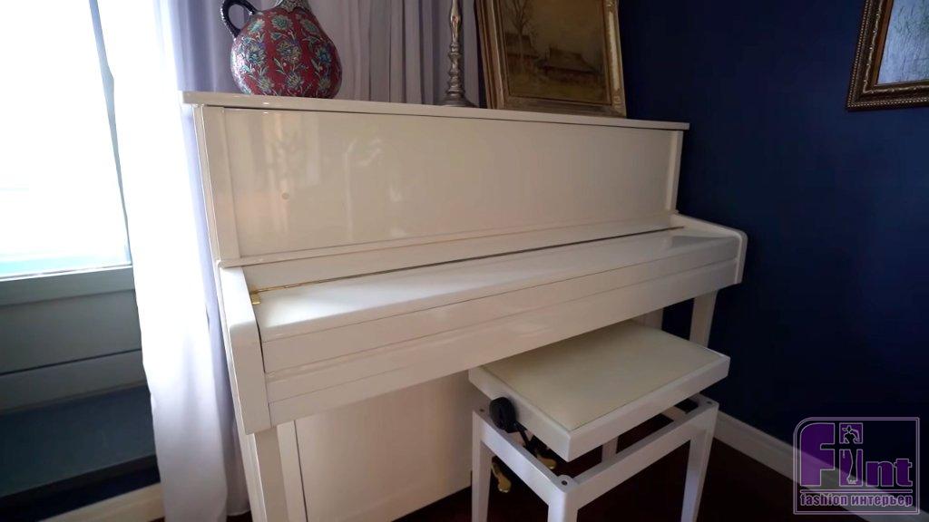Шкафы выполнены в изящном классическом стиле и смотрятся в гостиной просто потрясающе. Просторная гостиная позволила установить в неё не только вместительные шкафы и огромный угловой диван, но и стильное белое пианино. Катя Гордон неоднократно пробовала свои силы в музыке, и пианино в интерьере Гордон – вполне оправданный аксессуар.