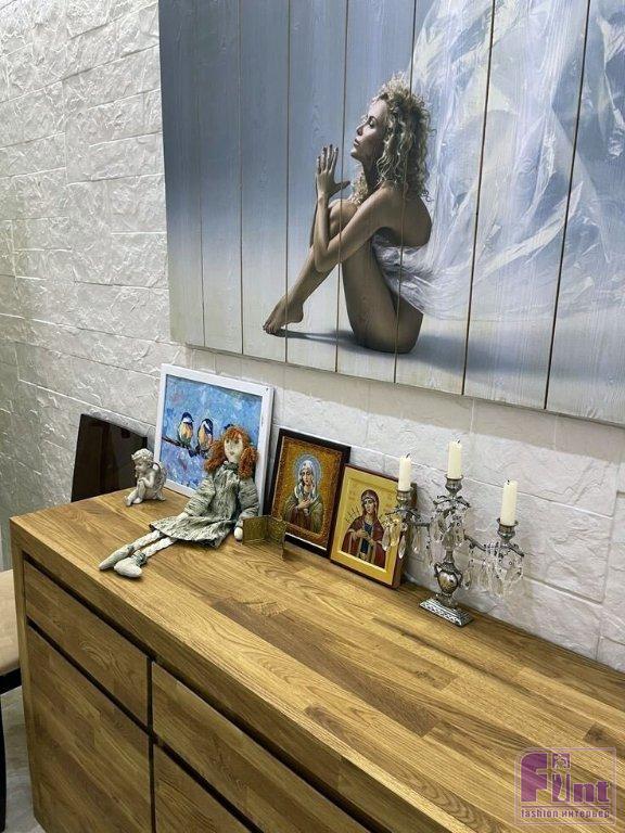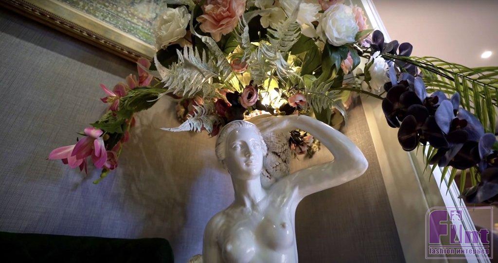 В прихожей установлено старое зеркало из дома отчима, эклектичный стол ручной работы и роскошная ваза в форме женского силуэта. Точно такую же вазу Екатерина установила в лифтовом холе, при входе в квартиру. В гостиной рядом с картинами можно увидеть православные иконы, а дополняет дизайн интерьера гостиной шахматная доска с фигурами, которая была подарена Екатерине. «Мне нравятся вещи, за которыми есть история. Я тащу в дом всё, за чем есть что-то человеческое», – рассказывает Екатерина.