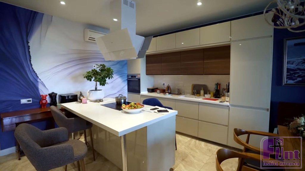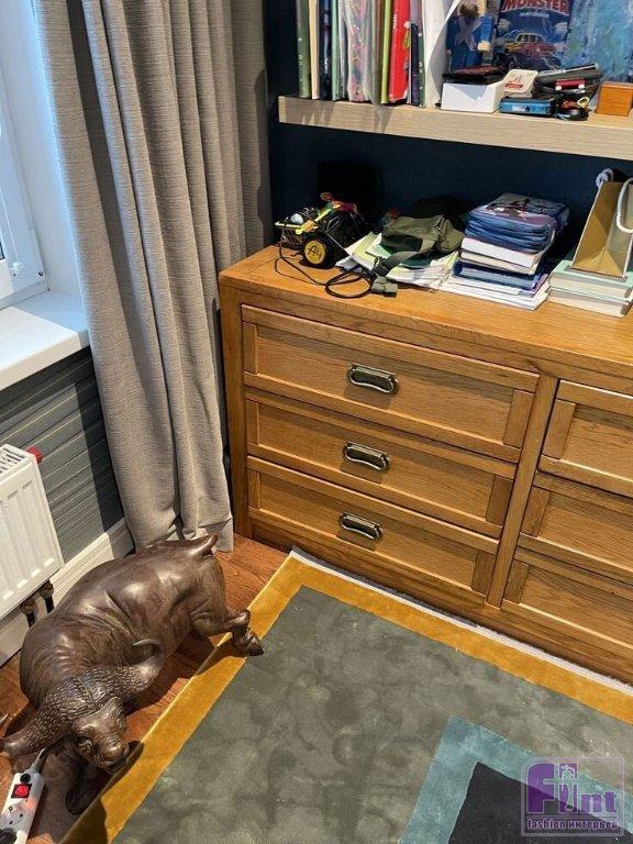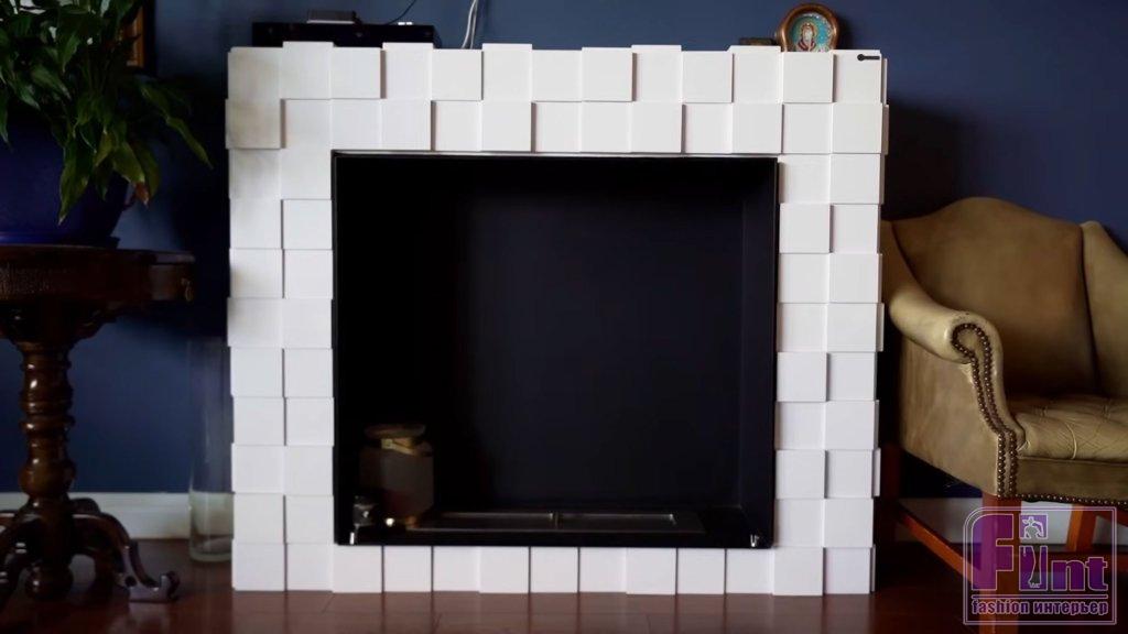 Ещё одним украшением гостиной является настоящий камин. По началу Екатерина активно использовала его для создания уютной атмосферы, но со временем поняла, что камин в городской квартире доставляет больше хлопот, нежели радости. В итоге дети Екатерины успели нечаянно разбить одну из стеклянных каминных ширм, да и прогорает камин довольно быстро, требуя новую порцию дров. Каминный портал оформлен в стильном современном ключе с использованием белой керамической плитки, что выделяет его на фоне стены, окрашенной в глубокий синий оттенок.