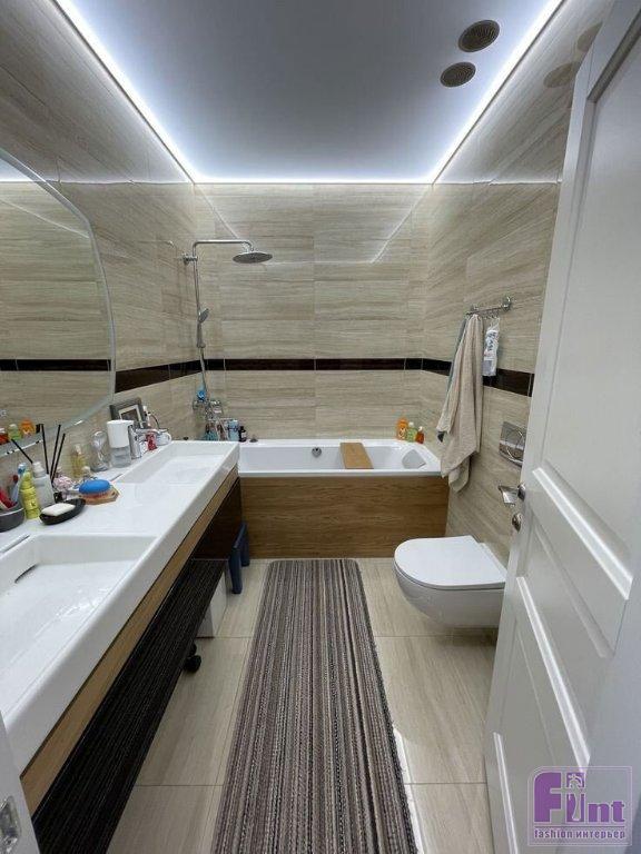 В квартире Кати Гордон есть две ванные комнаты. Одна из них совмещена с туалетом. Ванну выбирали специально, чтобы можно было на неё установить перекладину, которая ассоциируется у Екатерины с детством. Именно на такой перекладине Катя в детстве сидела, опустив ноги в ванную. Экран на ванной сделан под стиль раковины – из панелей, ламинированных под натуральное дерево. Во второй ванной в квартире Гордон обустроена мини-сауна. Спроектировали её таким образом, чтобы можно было сразу из душа попасть в парилку. Раковина в этом санузле сделана из цельного куска камня. Тумбу под эту массивную и тяжёлую раковину делали на заказ, поскольку нужно было что-то основательное и устойчивое.