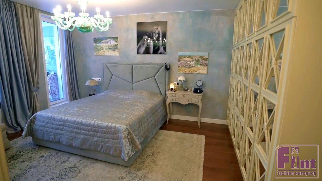 Стены в хозяйской спальне расписаны вручную. «В остальных комнатах всё тёмное, а здесь мне захотелось светлого, ощущения того, что мы на небе», поясняет выбор краски Екатерина, которая вполне довольна своим текущим местом жительства. «Жизнь маленькая, поэтому нужно просыпаться и смотреть на то, что тебе красиво. Живите в красоте, сколько бы денег у вас ни было», – советует Катя своим подписчикам в соцсетях.
