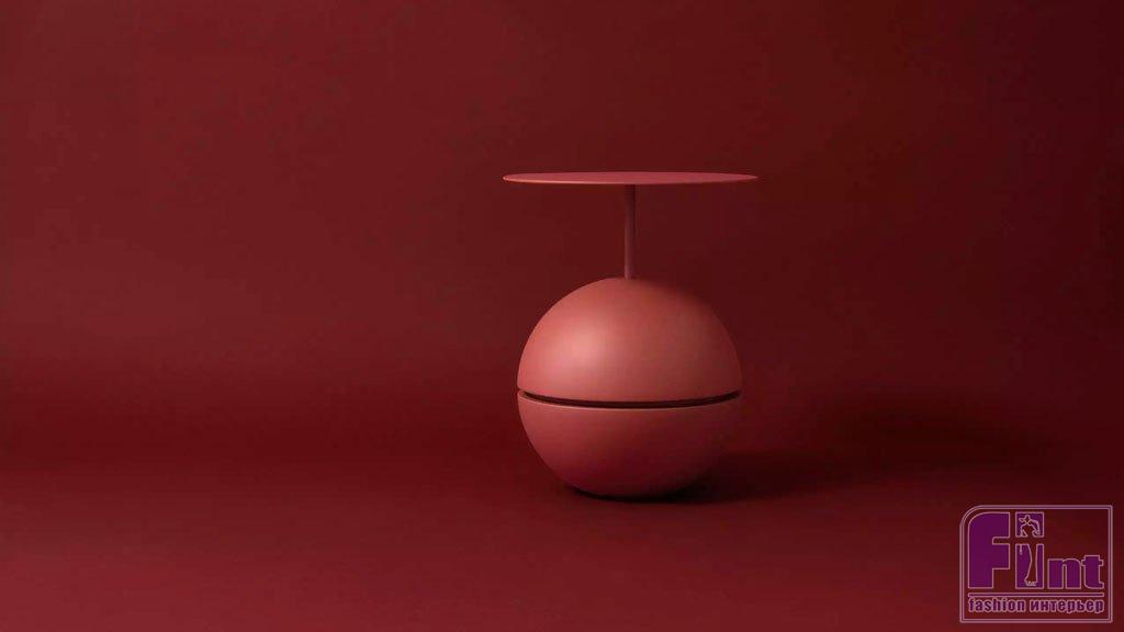 Столик «Стоик» лаконичен, сдержан и, несмотря на округлые формы, весьма устойчив. Шарообразное основание сначала изготавливают на станке, а затем шлифуют вручную. Верхняя часть сделана из листовой стали с полимерным покрытием. Стол может быть выполнен как в матовой, так и глянцевой отделке и в 33 вариантах расцветки.