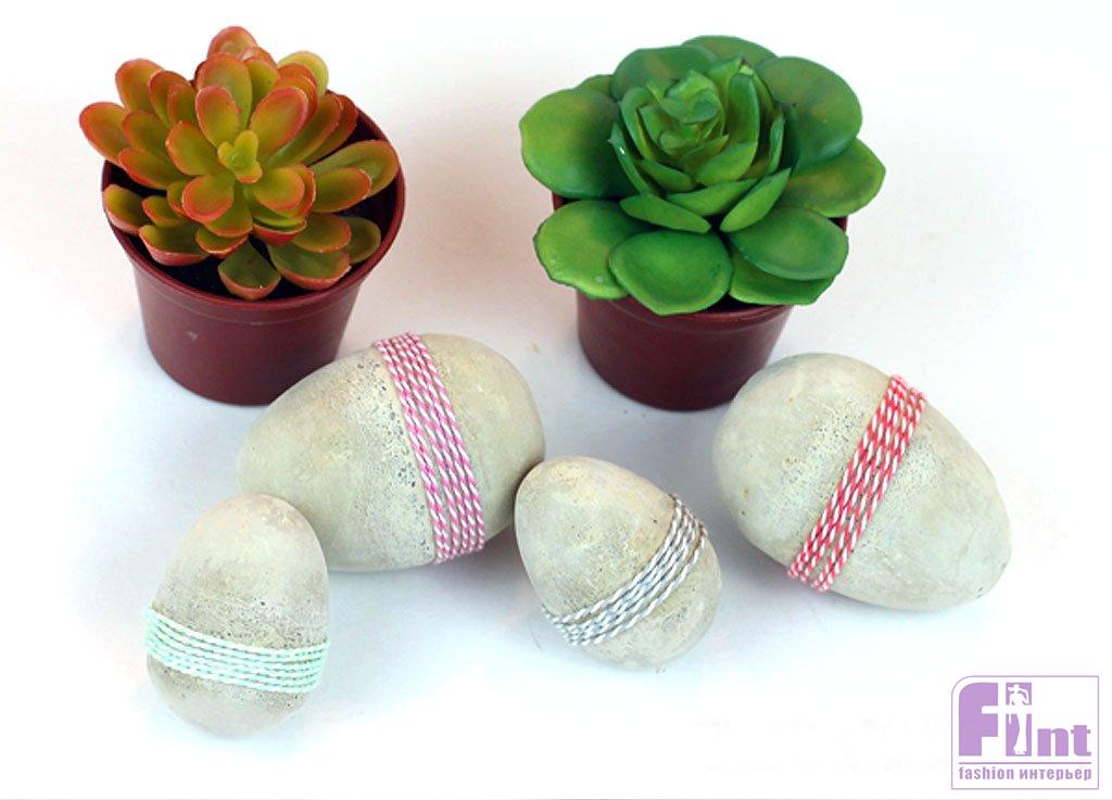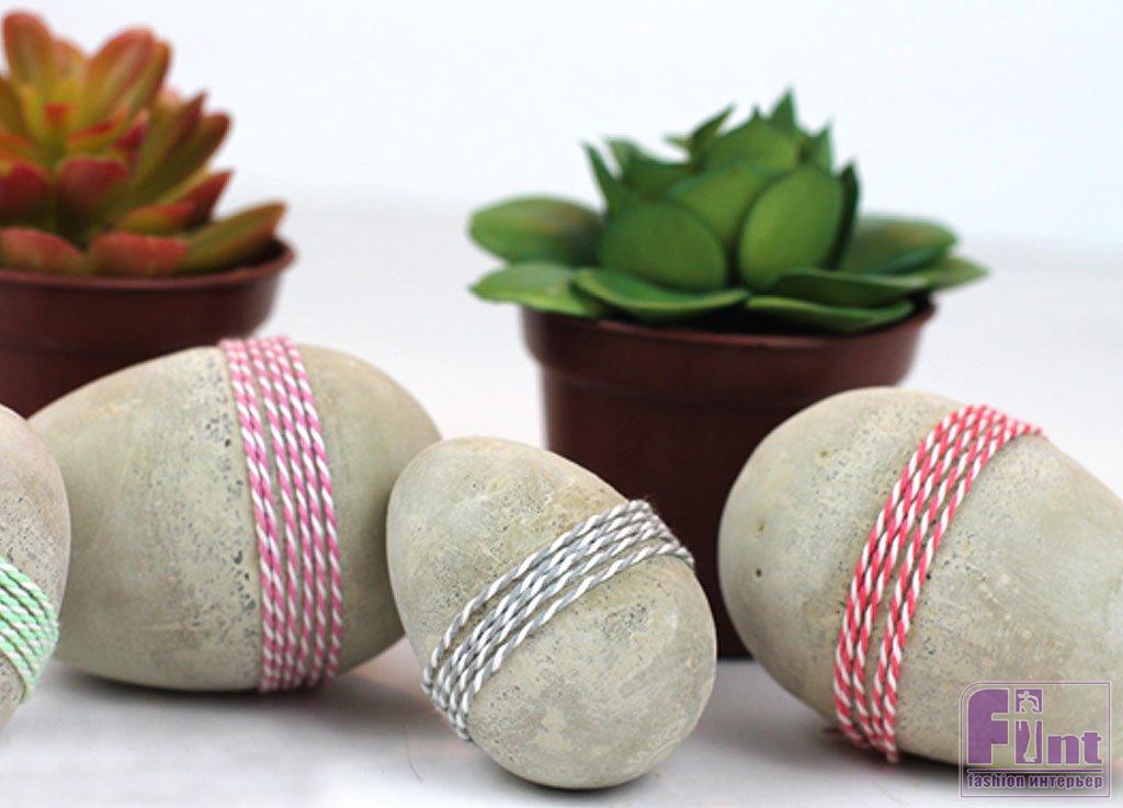 Для того чтобы наши яички из цемента выглядели по-настоящему празднично, добавьте к ним несколько витков красивого витого шпагата или толстых разноцветных нитей, обернув заготовки примерно посередине формы.