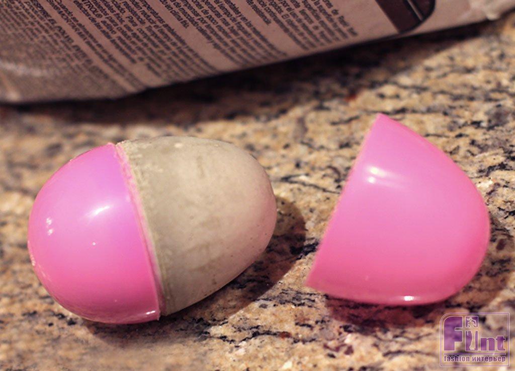 Обычно цемент в объёме куриного яйца затвердевает в течение суток. Но если у вас быстросохнущая смесь, то достаточно будет выдержать несколько часов, прежде чем снимать пластиковую форму с заготовки. Иногда цемент довольно прочно схватывает пластиковую форму. В этом случае просто аккуратно разрежьте пластиковое яйцо с помощью острого ножа, чтобы удалить пластик с заготовок.