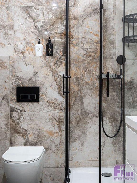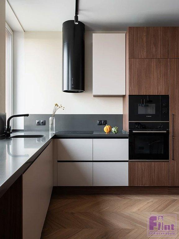 Стиральную машину установили на кухне, так как в ванной для неё не было места. И предусмотрели достаточно систем хранения. «Некая сложность присутствовала при проектировании кухни по причине неровных углов по задумке архитектора здания. Из-за угла примерно 60 градусов нужно было постараться сделать столешницу таким образом, чтобы выдвижные ящики и дверцы не пересекались при открывании», — добавляет дизайнер.