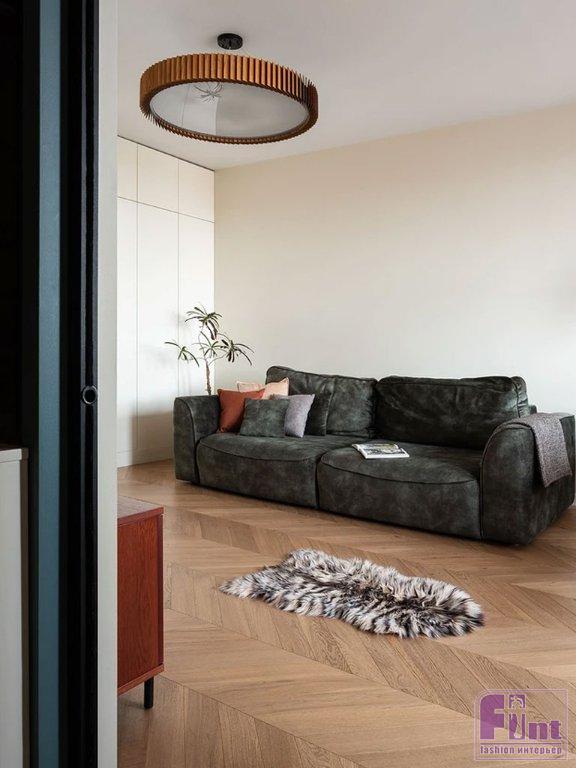Это евротрёшка, как принято называть сегодня такие планировки — кухня-гостиная, две изолированные комнаты, балкон, ванная комната и коридор. Перепланировку не делали, но решили увеличить высоту дверных проёмов до 2,3 метра, чтобы визуально подчеркнуть довольно высокие (2,8 метра) потолки и ещё больше их зрительно «приподнять».