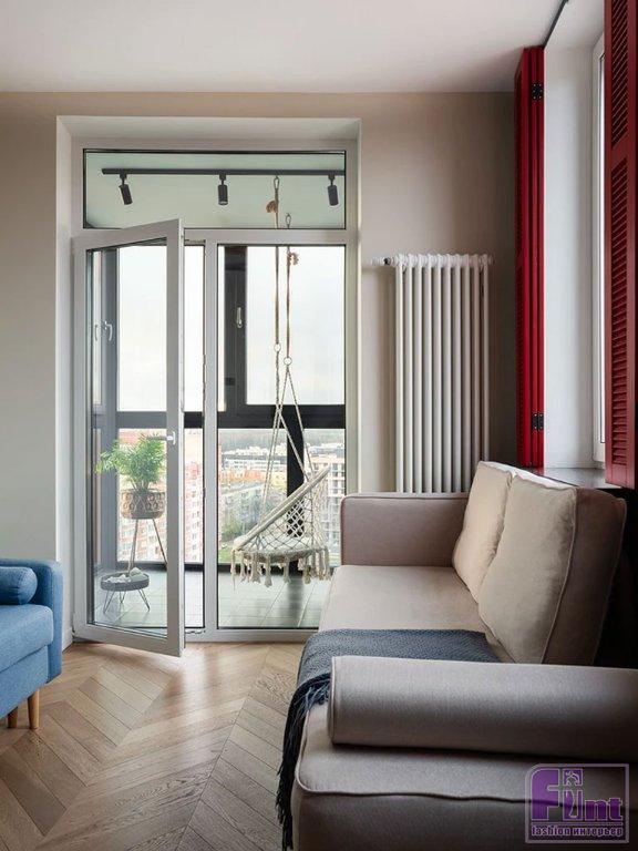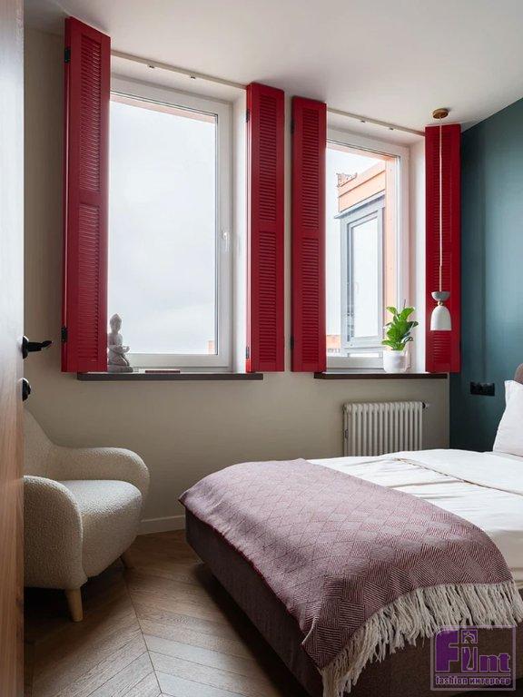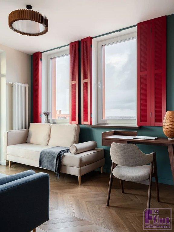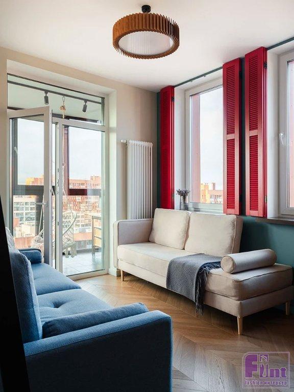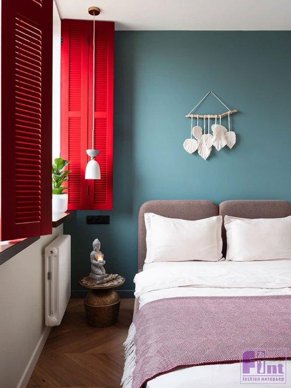 Для отделки стен выбрали краску, на полу — инженерная доска. В ванной комнате и на балконе использовали керамогранит, стены ванной отделаны керамогранитом. «Природные оттенки и натуральность фактур легли в основу отделочных материалов, — комментирует Анастасия. — Базовым цветом всего пространства был выбран оттенок тофу, который использован для ассоциации с белым песком побережья. Акцентные стены синего цвета сделаны во всех помещениях на одной и той же стороне, что создаёт ритм. Пол медового оттенка смягчает яркие контрасты». Вместо штор в спальнях дизайнер решила сделать ставни яркого малинового оттенка, которые однозначно привлекают к себе много внимания и являются акцентными точками пространства.