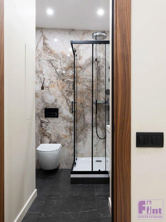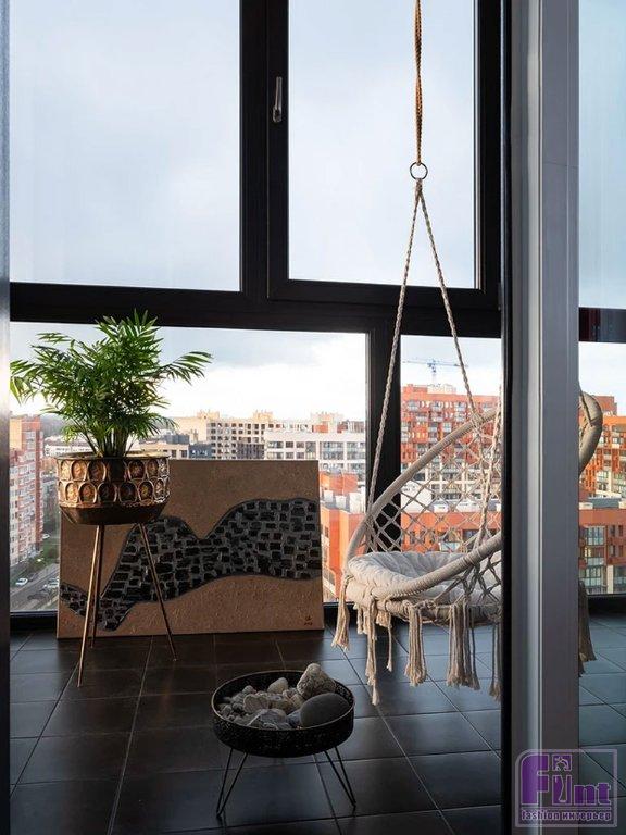 По просьбе хозяйки в зоне гостиной предусмотрели использование проектора. Стену напротив дивана оставили пустой, чтобы проектировать изображение на неё. Размер тумбы продумывали тоже с этой целью. В ванной комнате хранение предусмотрено в виде тумбы под раковину и подвесных полочек в душевой. На балконе смонтировано подвесное кресло. Это место для отдыха и расслабления, которое хотели видеть в своей квартире мама и дочка. Потолочное освещение реализовано в виде люстр и трековых светильников. Также используются подвесы над обеденным столом, у кровати в спальне, торшер, настольные лампы. В прихожей предусмотрели скрытую подсветку в плинтусе, которая очень функциональна в вечернее и ночное время суток.