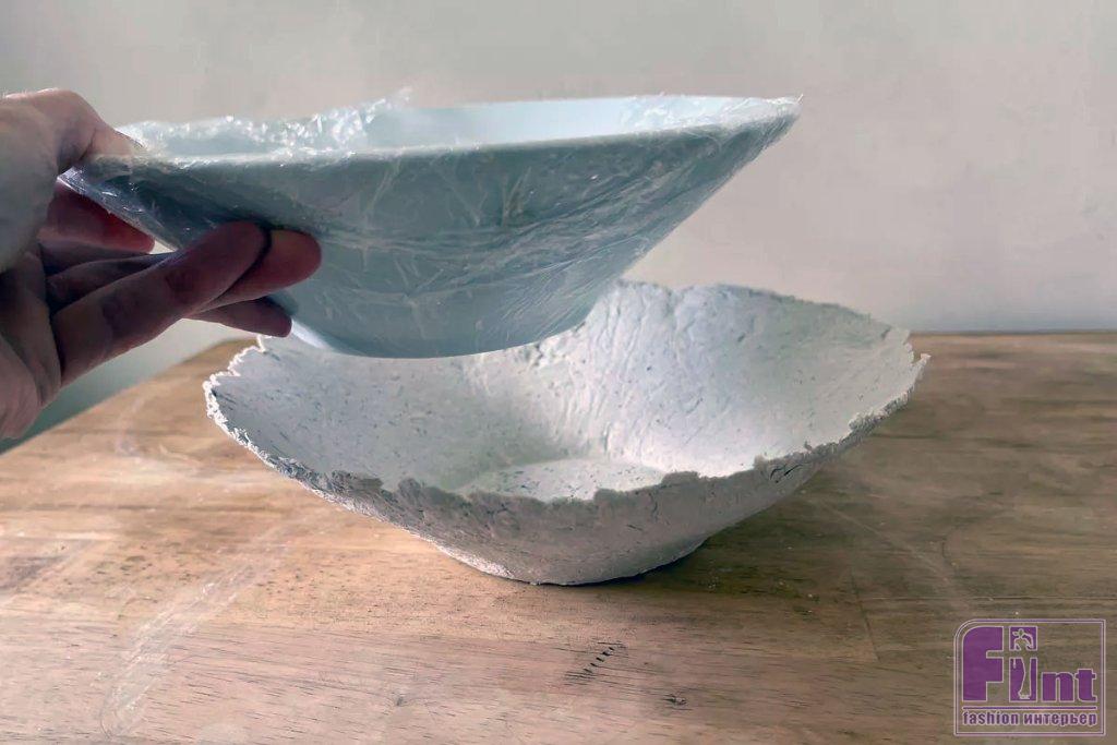 Как только папье-маше полностью высохнет и затвердеет на ощупь, осторожно извлеките используемые в качестве шаблона миски. Поскольку полиэтиленовая плёнка гораздо лучше прилипает к гладкой поверхности мисок, она останется на шаблонах, легко отделившись от заготовок из папье-маше.