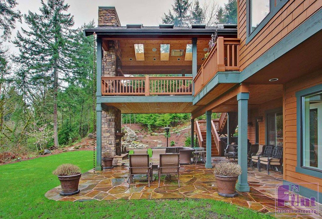 Круговая терраса — традиционный спутник домиков в стиле шале и построек на сваях. Она обрамляет дом, будто палуба, и придает особое настроение архитектуре. Кроме того, дополнительное пространство — это всегда практично. С одной стороны можно расположить летнюю кухню и поставить мангал, с другой — организовать столовую, с третьей — повесить гамак, а с четвертой — сделать игровую зону для детей, повесить качели или поставить спортивный комплекс. Подобная пристройка объединяет в себе преимущества традиционной открытой террасы, павильона, уличной кухни и крытой веранды.